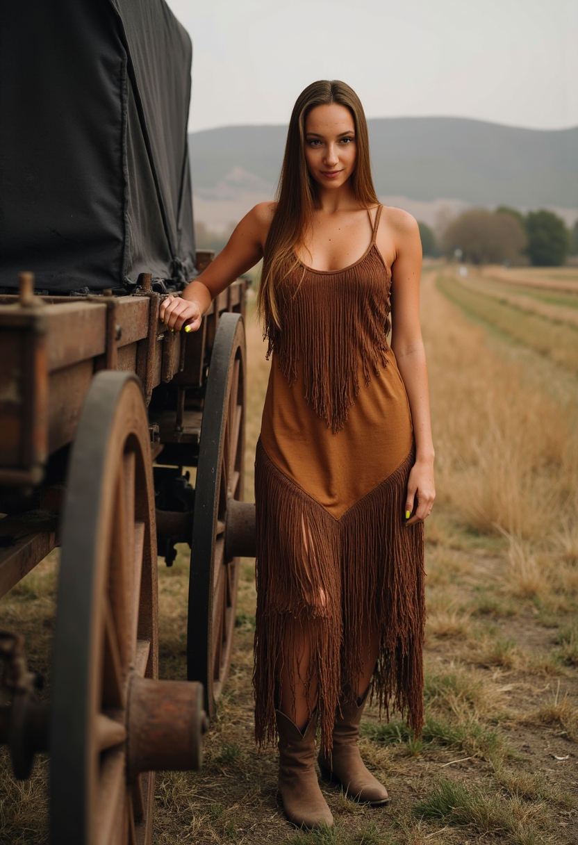 Женщина в длинном платье с бахромой и ковбойских сапогах стоит у старой повозки, прямо смотрит в камеру