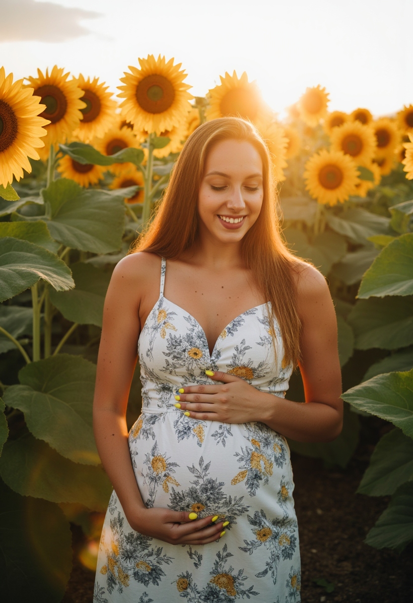 Женщина в длинном платье с цветочным принтом стоит на фоне поля подсолнухов, она улыбается и нежно гладит живот