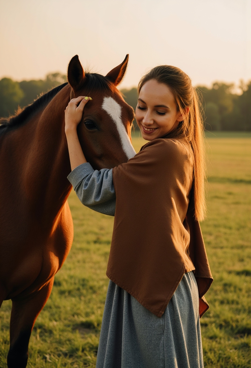 Женщина в длинном платье с кожаной накидкой стоит рядом с лошадью, поглаживая её шею, за спиной зелёный луг и солнце