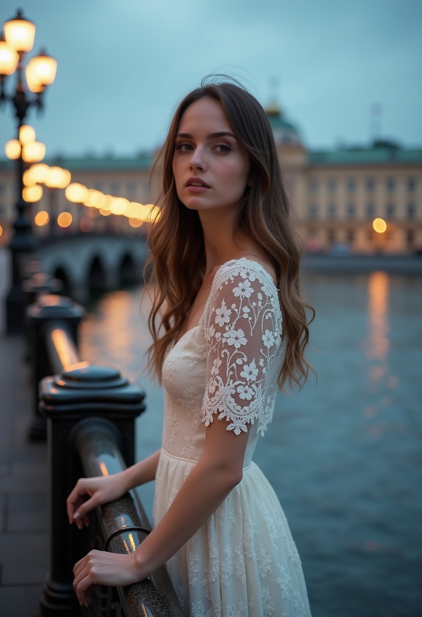 Женщина в длинном платье с кружевами стоит на набережной Фонтанки, её руки касаются парапета, а глаза направлены вдаль. Позади ажурные мосты и отражения фонарей в воде. Крупный план, подчёркивающий романтическое настроение города.