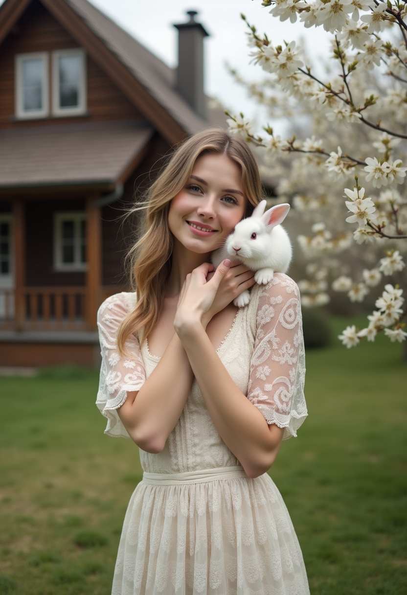 Женщина в длинном платье с кружевами стоит в саду, её руки держат на плече маленького белого кролика. Она смотрит прямо в камеру, её глаза светятся радостью. Позади расцветающие деревья и деревянный дом с покатыми крышами. Крупный план, подчёркивающий чистоту и нежность пасхального утра.