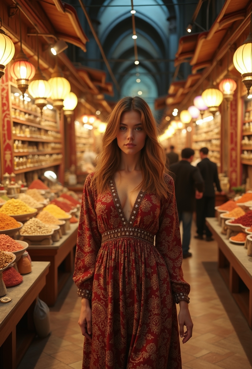 Женщина в длинном платье с восточным принтом идёт по Гранд-базару, её взгляд направлен прямо в камеру. Вокруг — витрины с лампами, коврами и специями. Крупный план, акцент на насыщенности и яркости сцены.