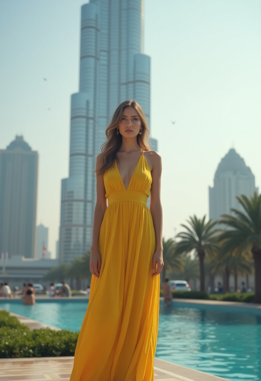 Женщина в длинном платье стоит на фоне Бурдж-Халифа, смотрит прямо в камеру, позади городской пейзаж