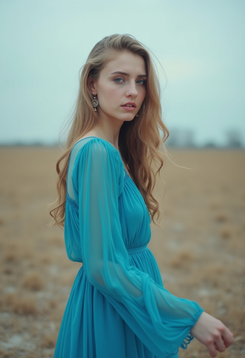 Женщина в длинном платье ярко-голубого оттенка стоит посреди пустого поля. Взгляд направлен вниз, выражение лица спокойное. Яркий оттенок платья контрастирует с сероватыми и песочными оттенками окружающего пространства. Крупный план.