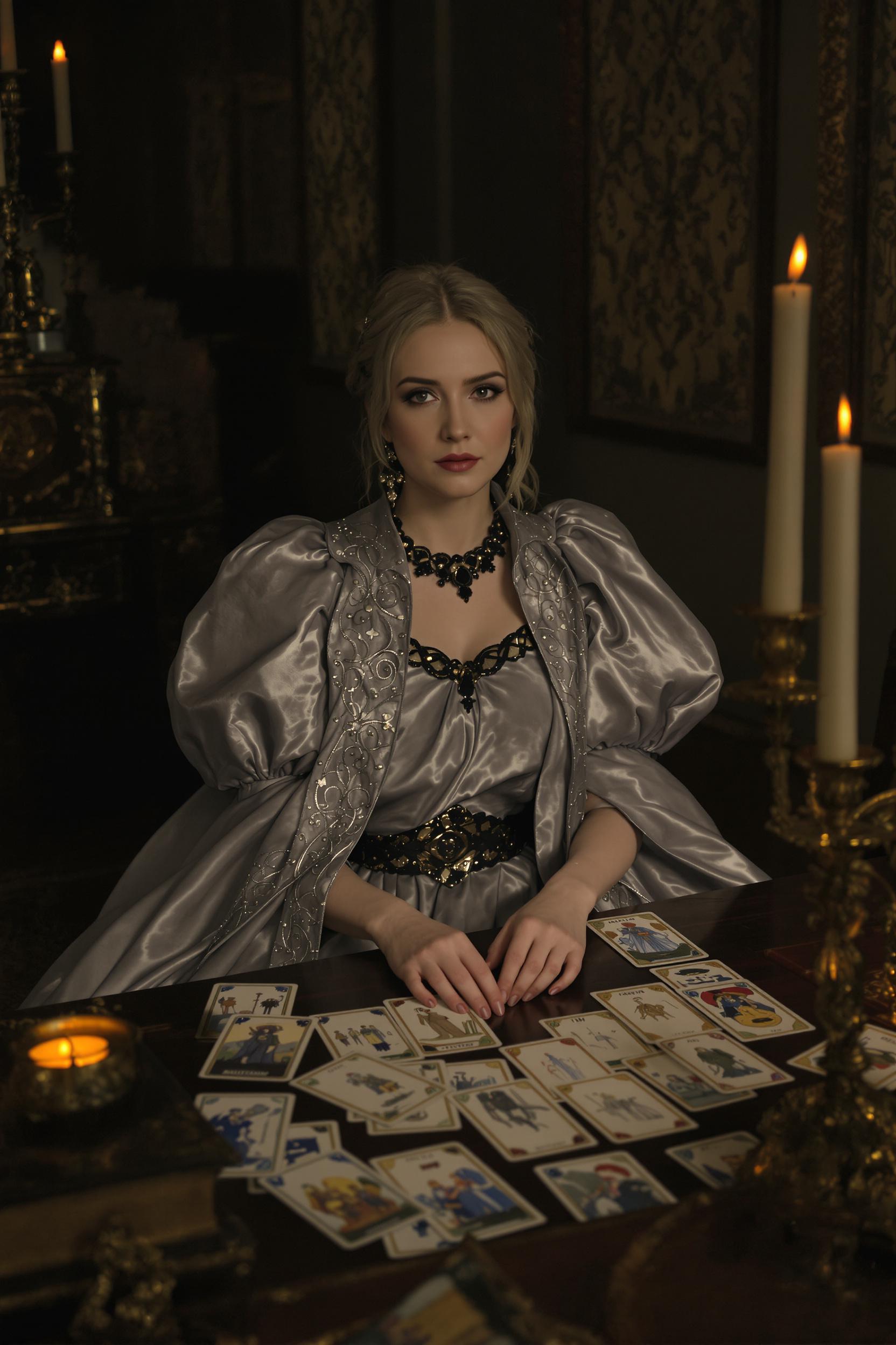 Женщина в длинном серебристо-сером платье с драпировками и пышными рукавами, на плечах расшитая накидка. Она сидит у стола с раскинутыми картами Таро, смотрит прямо в камеру. Рядом лежат старинная книга и висят подсвечники, таинственный полумрак.