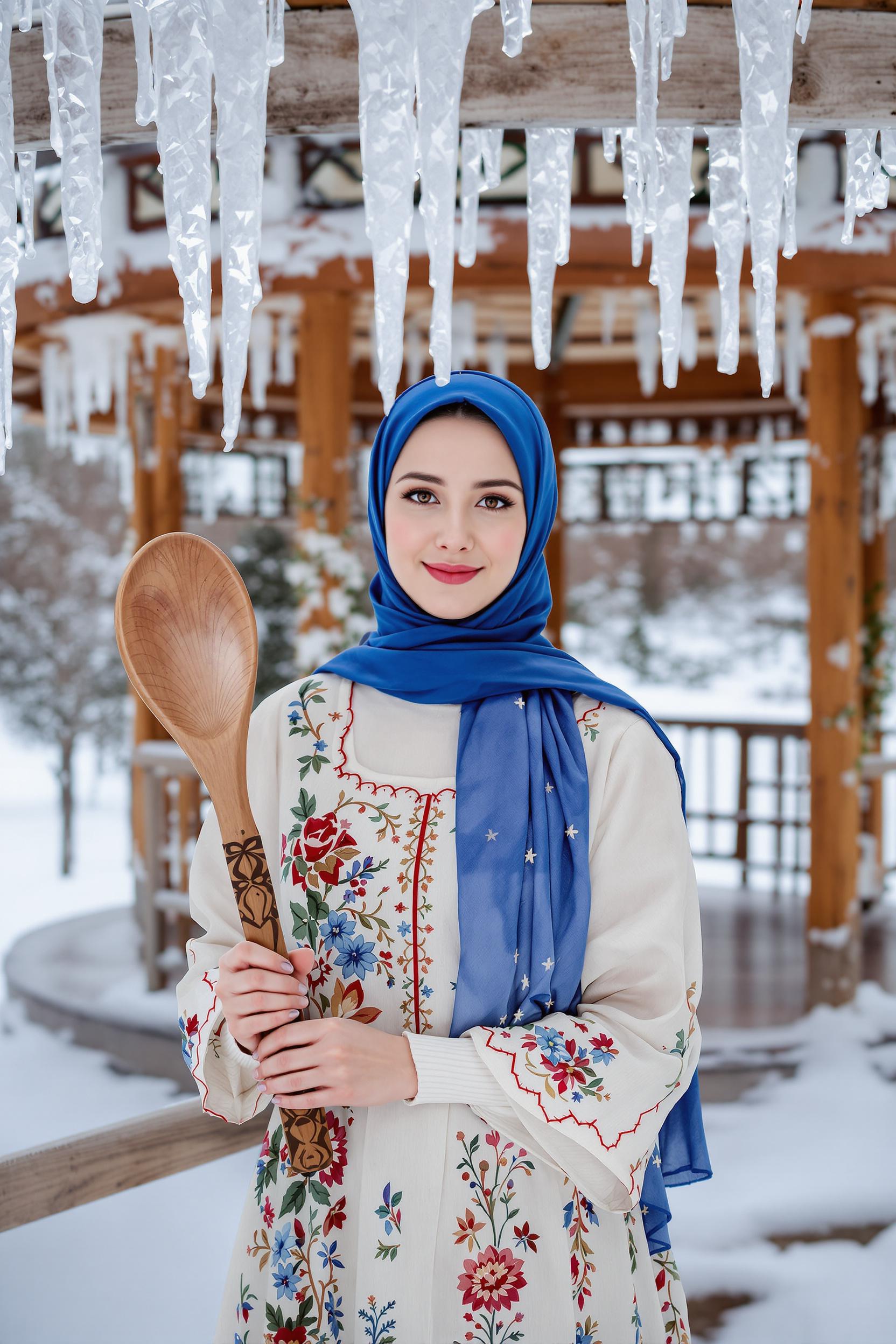 Женщина в длинном синем платке и вышитом сарафане стоит у деревянной беседки, украшенной ледяными узорами, держит в руках резную деревянную ложку, смотрит прямо в камеру, вокруг прозрачный морозный воздух и снежные сугробы.