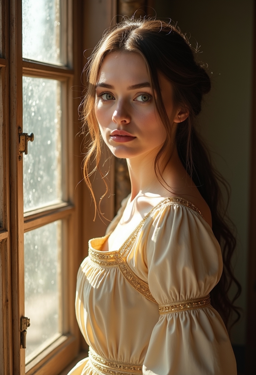 Женщина в длинном золотистом платье в стиле эпохи Возрождения стоит у окна, её руки сложены на груди, а взгляд направлен вниз. Свет падает сбоку, создавая мягкие тени, подчёркивающие текстуру ткани и кожи. Позади размытый фон, напоминающий портреты да Винчи. Крупный план, акцент на драматическом...