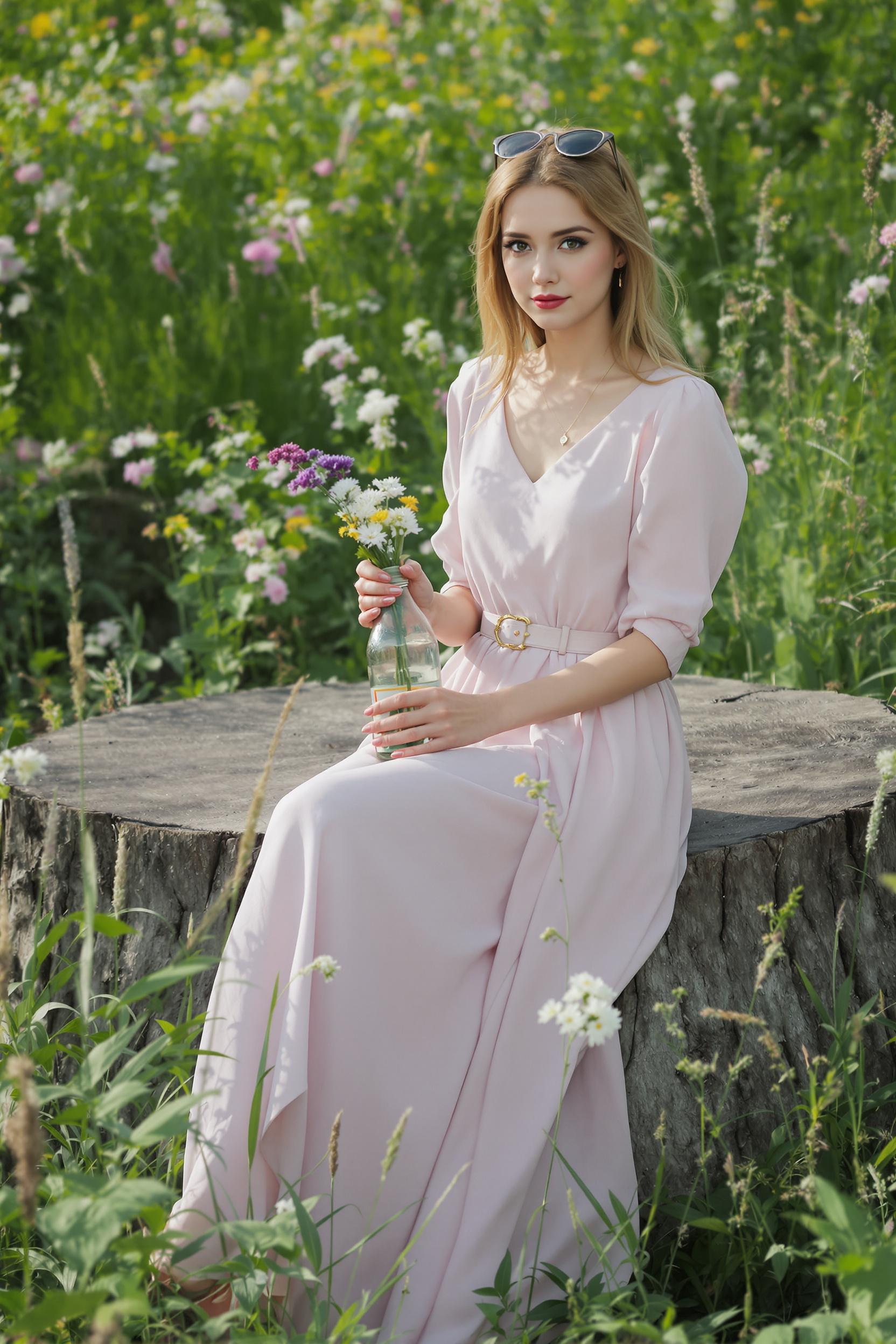 Женщина в длинном светло-розовом платье с поясом сидит на большом деревянном пне среди луговых трав, в руках держит прозрачную бутылку с дикими цветами, задумчиво смотрит прямо в камеру, вокруг мягкий дневной свет и летняя зелень.