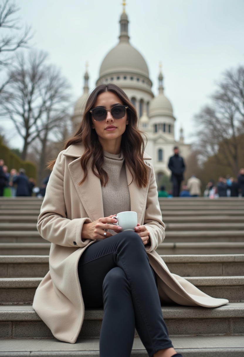 Женщина в длинном светлом пальто и тёмных солнцезащитных очках сидит на ступенях Сакре-Кёр, её рука держит чашку кофе, а другая опирается на колено. Позади белоснежный купол базилики возвышается над Монмартром. Крупный план, акцент на расслабленности и архитектурном величии.