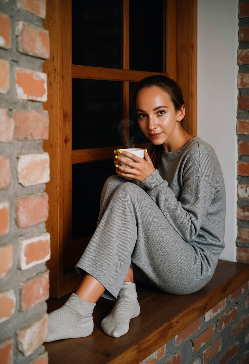 Женщина в длинном свитере и шерстяных носках сидит на деревянном подоконнике, держит кружку с парящим чаем, смотрит прямо в камеру, позади кирпичная стена