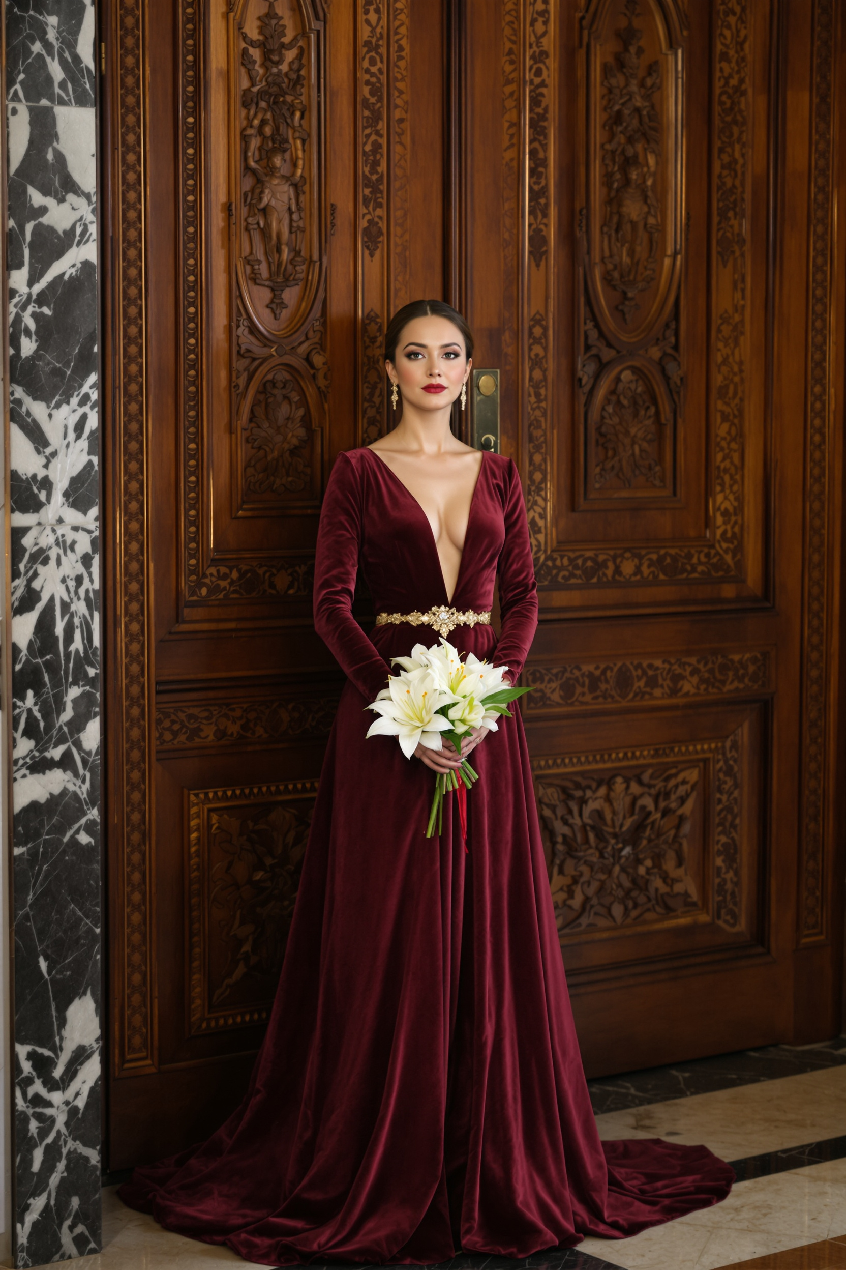 Примерить образ на себеЖенщина в длинном темно-бордовом бархатном платье с глубоким декольте и изысканным золотым поясом, стоит возле огромной резной двери тронного зала с букетом лилий в руках, уверенно смотрит в камеру, вокруг мрамор и резьба по дереву.