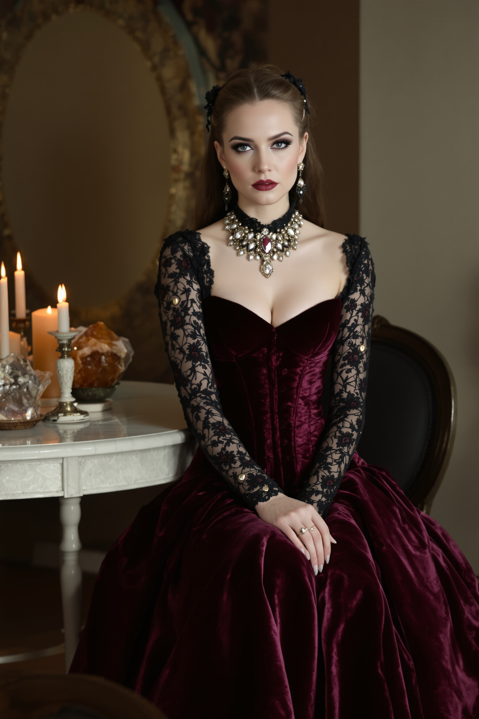 Женщина в длинном тёмно-бордовом бархатном платье с кружевными рукавами и высоким корсетом, на шее массивное украшение с камнем. Она сидит у круглого стола со свечами и кристаллом, руки лежат на столе, пристально смотрит в камеру, поза загадочная и строгая.