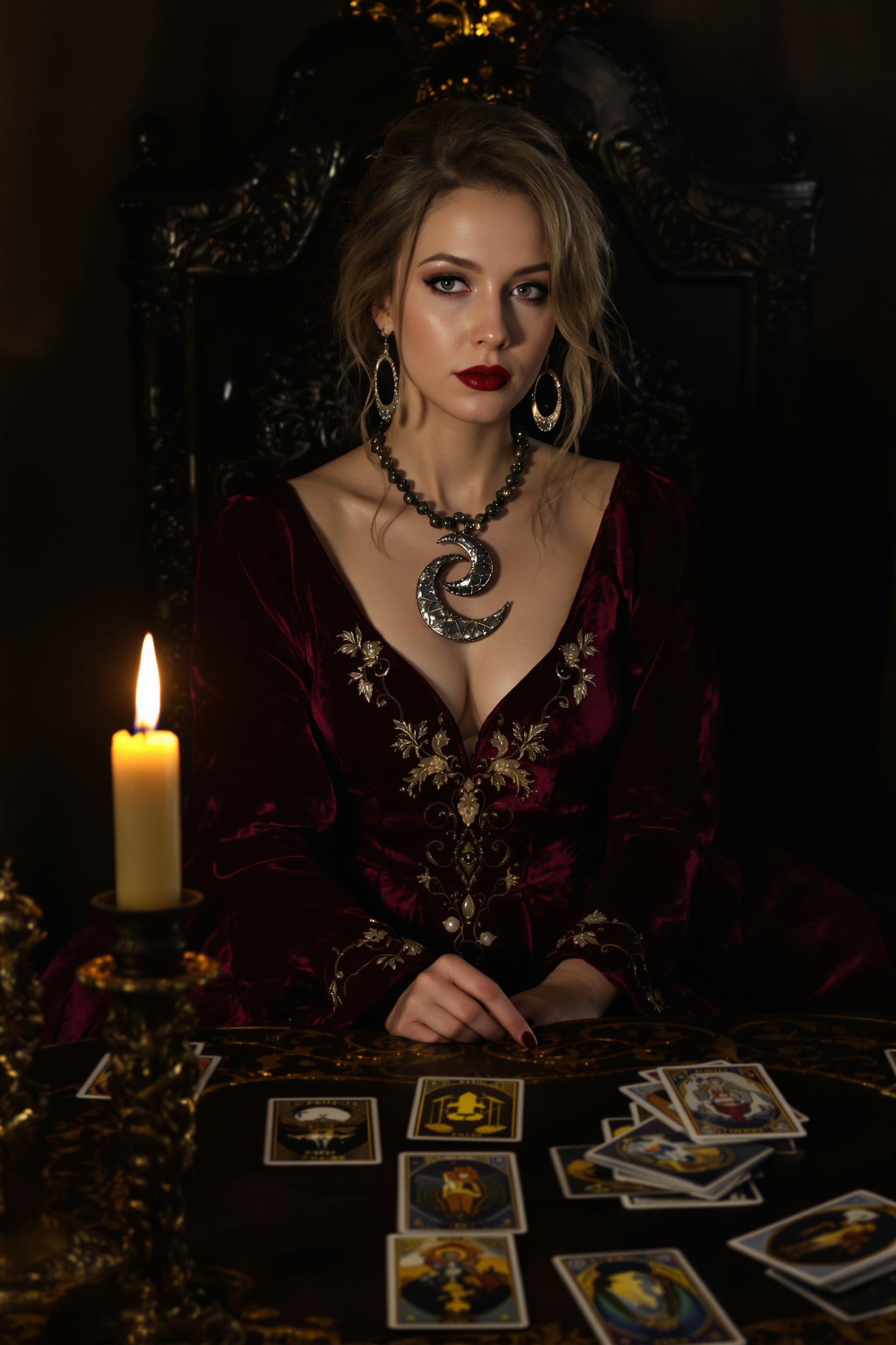 Женщина в длинном темно-бордовом платье с вышивкой, на шее массивный кулон в виде полумесяца. Она сидит за резным столом, усыпанным картами Таро, витая свеча сбоку. Женщина смотрит прямо в камеру, атмосферный полумрак, мистическая аура.