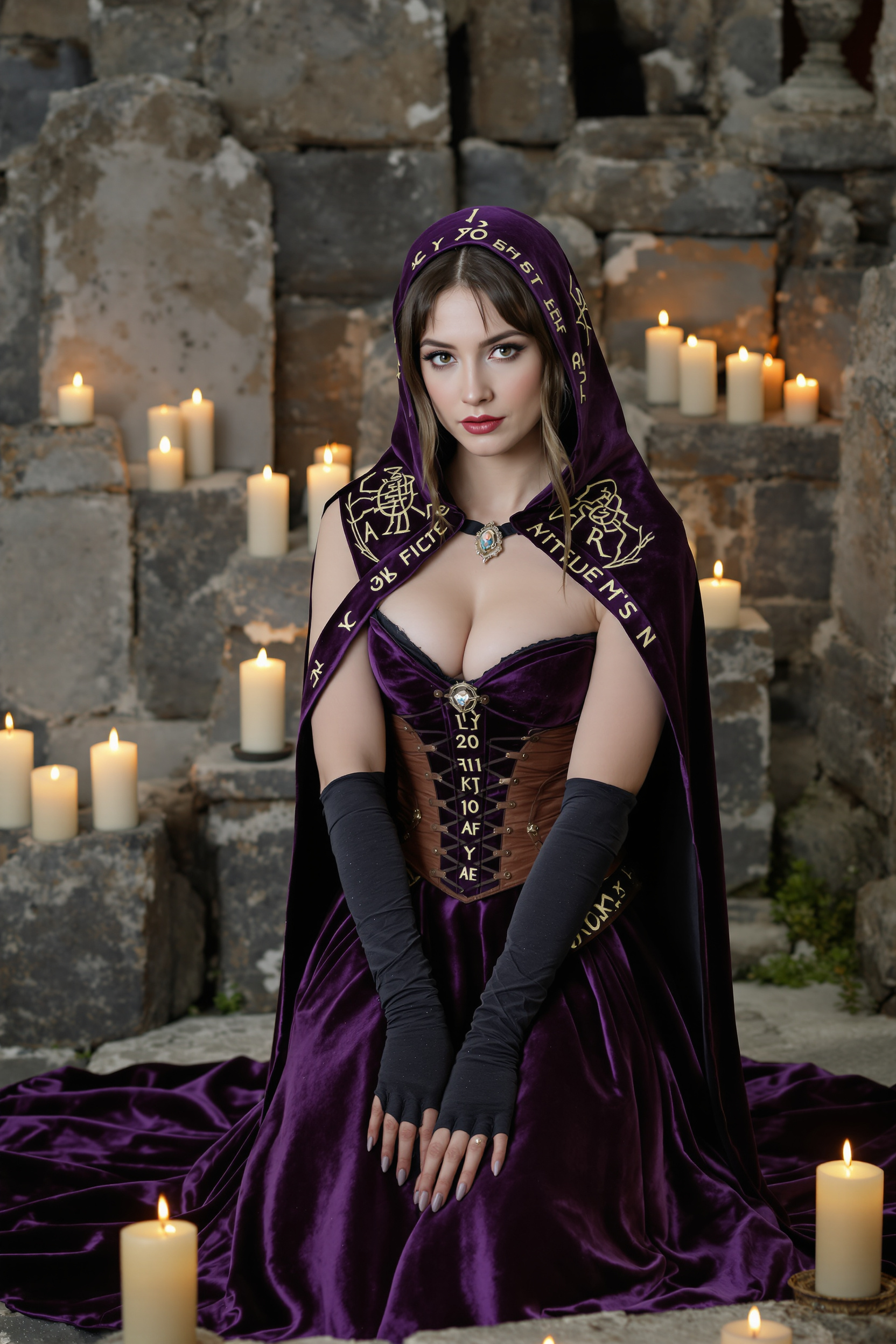 Женщина в длинном тёмно-лиловом платье с бархатным корсетом и пелериной, украшенной расшитыми рунами. На руках перчатки до локтя, на поясе кожаный ремешок с небольшими амулетами. Она стоит на коленях среди свечей на старых каменных плитах, смотрит прямо в камеру, руки сложены в таинственный жест.
