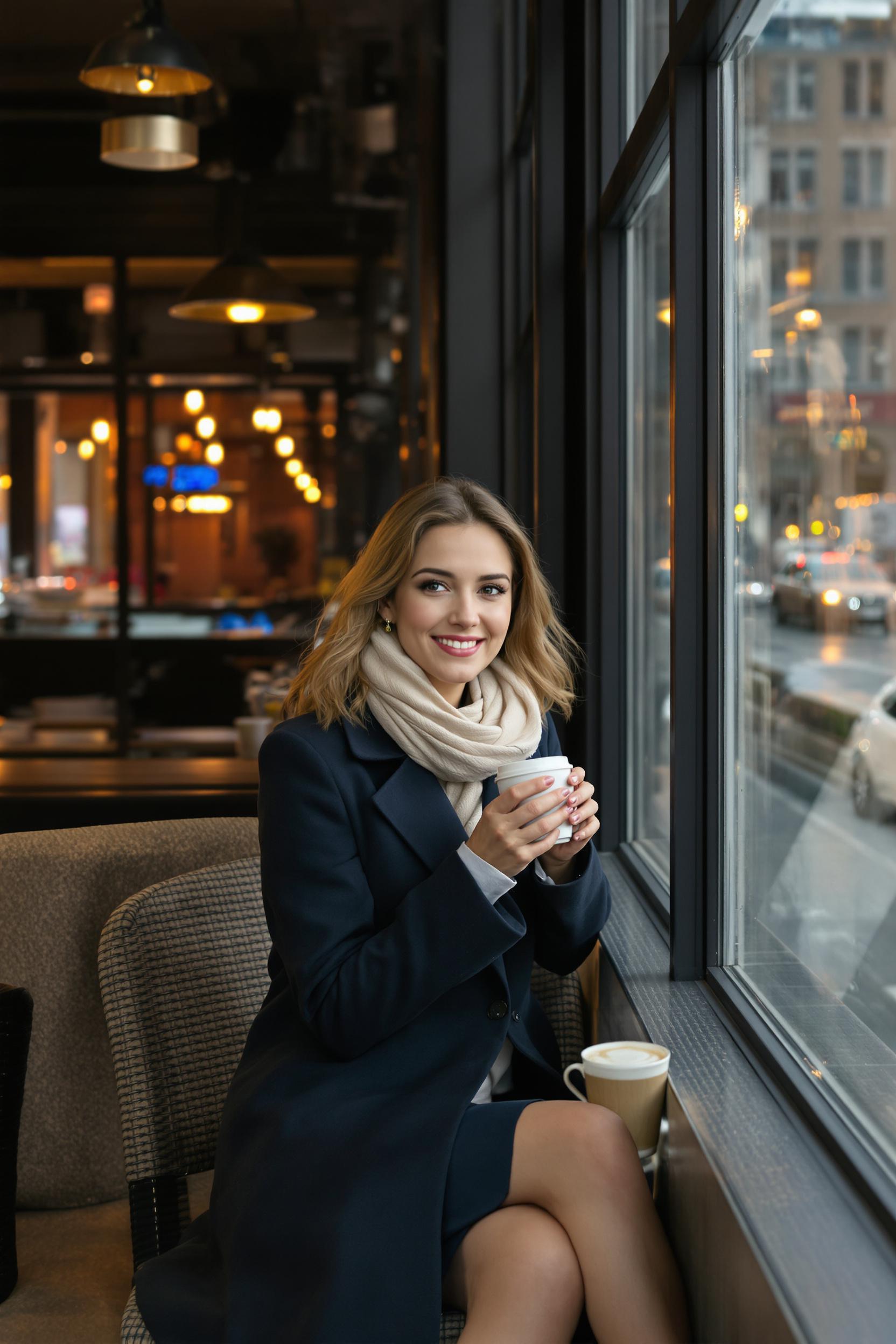 Женщина в длинном тёмно-синем пальто и светлом шарфе сидит у окна в кофейне с индустриальным интерьером, в руках чашка кофе, на фоне городские огни, на лице милая улыбка, она смотрит прямо в камеру, вокруг тёплый уютный свет.