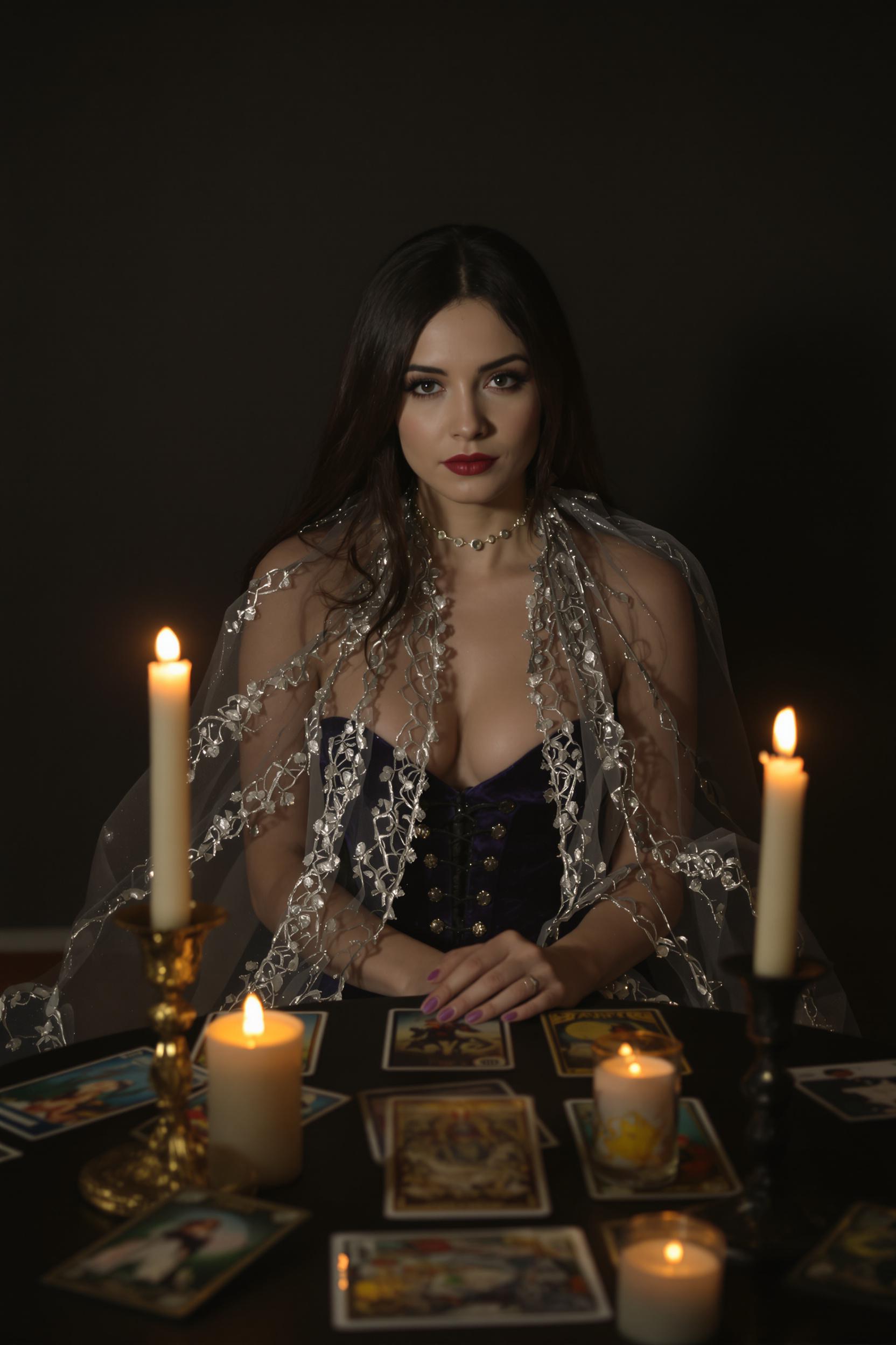 Женщина в длинном темном платье с бархатным корсетом и на плечах широкая шаль из тюля с серебристым узором. Она сидит за круглым столом, усыпанным картами Таро и зажженными свечами, уверенно смотрит в камеру, таинственная атмосфера.