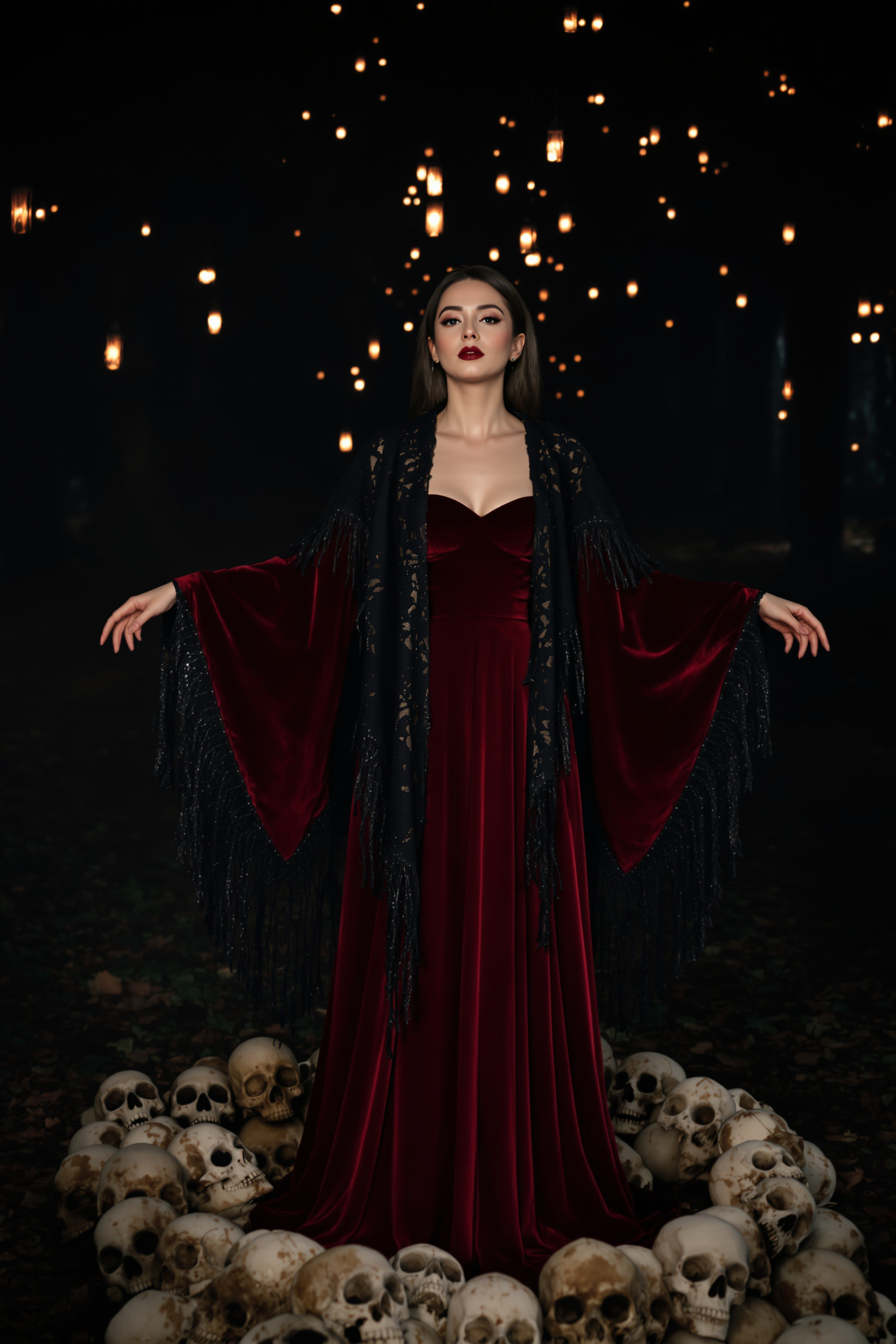 Женщина в длинном винно-красном платье с бархатным лифом и широкими рукавами, на плечах тёмная кружевная накидка с бахромой. Стоит, немного наклонившись над кругом черепов, расставив руки по сторонам, фон — мерцающие фонари в тёмном лесу, взгляд в камеру.