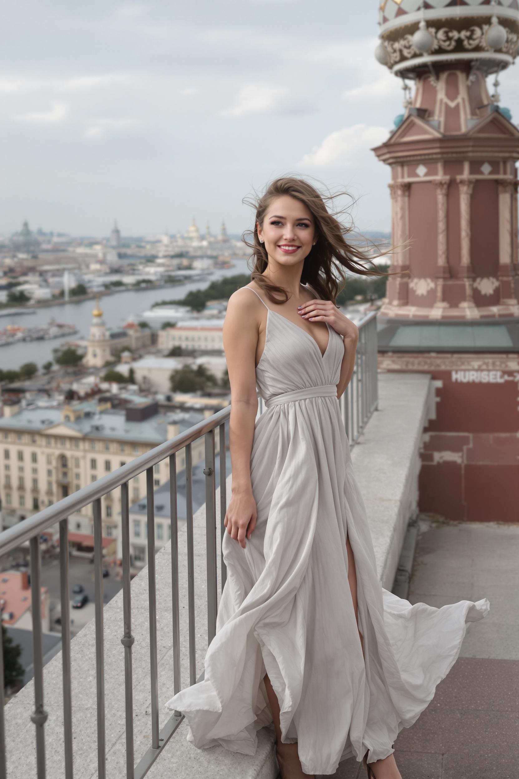 Женщина в длинном воздушном платье стоит на крыше в Санкт-Петербурге, позади открывается панорама города с видом на Неву и купола Исаакиевского собора. Она смотрит в камеру с мягкой улыбкой, ветер играет её волосами. Крупный план, ощущение свежести и романтики.