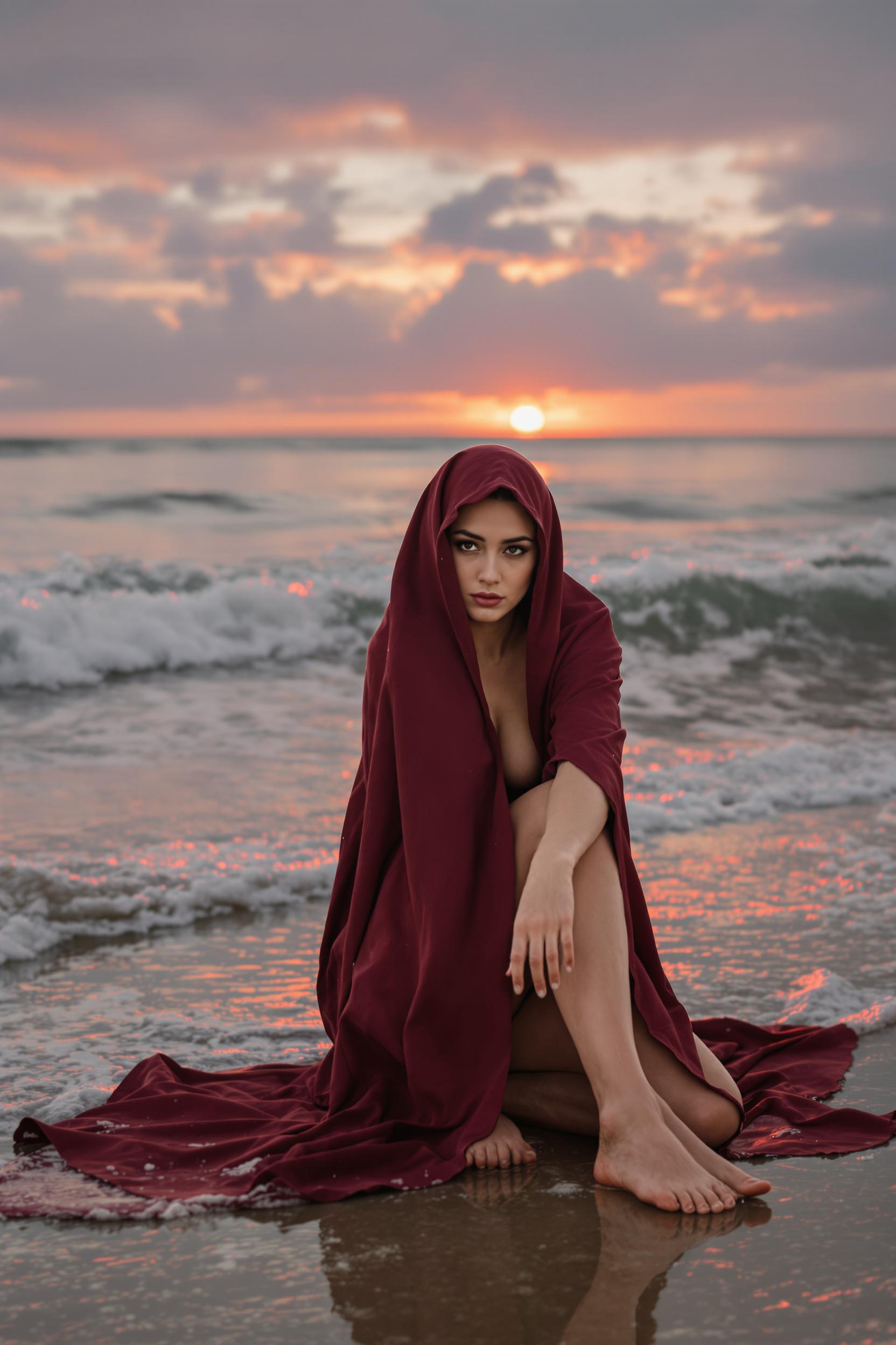 Женщина в длинной накидке цвета бордо поверх короткого купальника, сидит на мокром песке у самой воды, обнимая колени. Красное закатное солнце отражается на ткани, она смотрит прямо в камеру, вокруг играют волны.