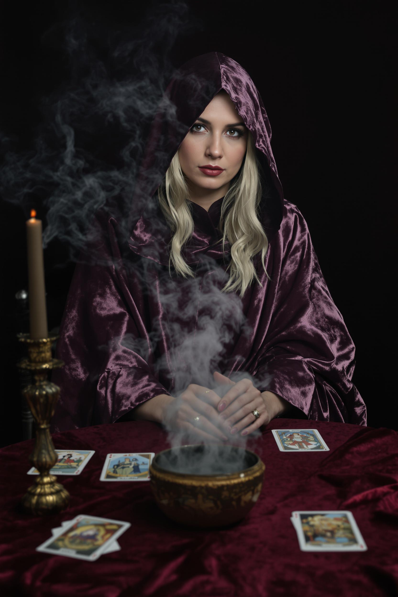 Женщина в длинной темно-сиреневой мантии с капюшоном и широкими рукавами сидит за круглым столом, покрытым бархатной скатертью. Перед ней аккуратно разложены карты Таро и стоит чаша с дымом. Она смотрит прямо в камеру, атмосфера магии.