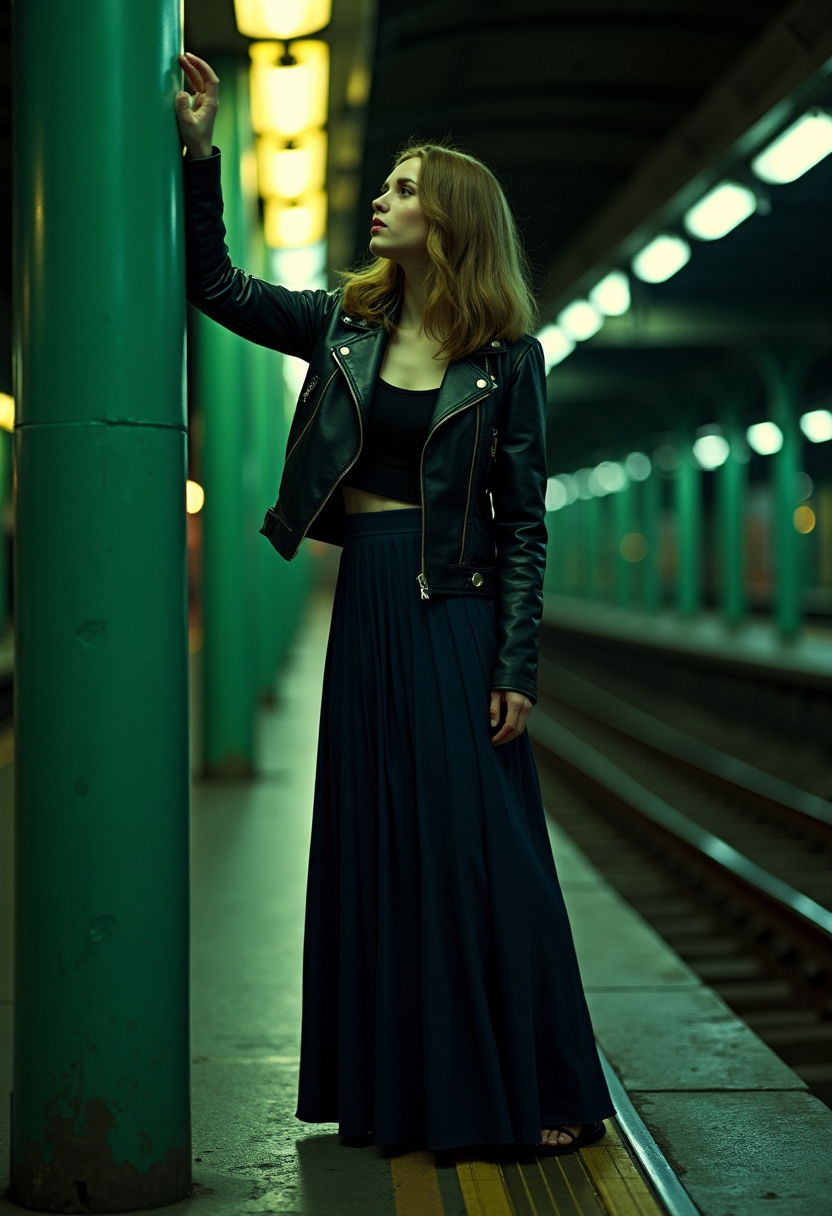 Женщина в длинной юбке цвета индиго и кожаной куртке стоит у колонны метро, подсвеченной зелёным и жёлтым светом. Её взгляд направлен вверх, одна рука лежит на колонне. Позади видны тусклые огни и следы поезда. Освещение контрастное, акцент на её силуэте.