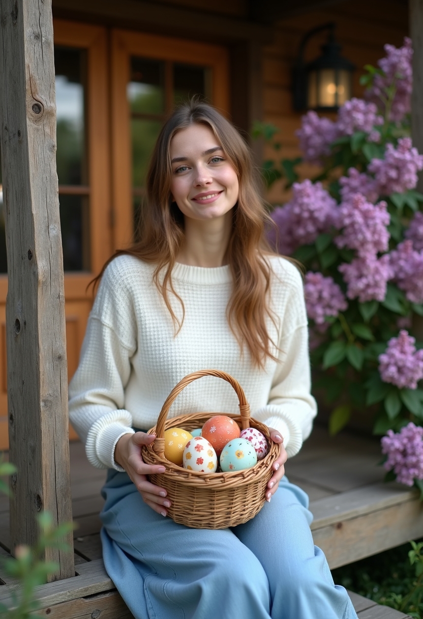Женщина в длинной юбке и белом свитере сидит на крыльце деревянного дома, держа в руках плетёную корзину с крашеными яйцами. Она смотрит прямо в камеру, её улыбка искренняя. Позади цветущие сиреневые кусты и деревянные резные наличники. Крупный план, создающий тёплую атмосферу весны и семейного уюта.
