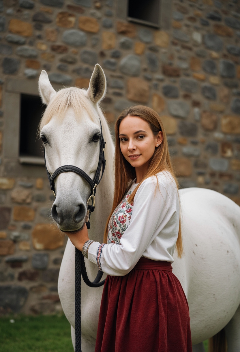Женщина в длинной юбке и блузке с вышивкой стоит рядом с белой лошадью, фон — каменная стена старинного замка