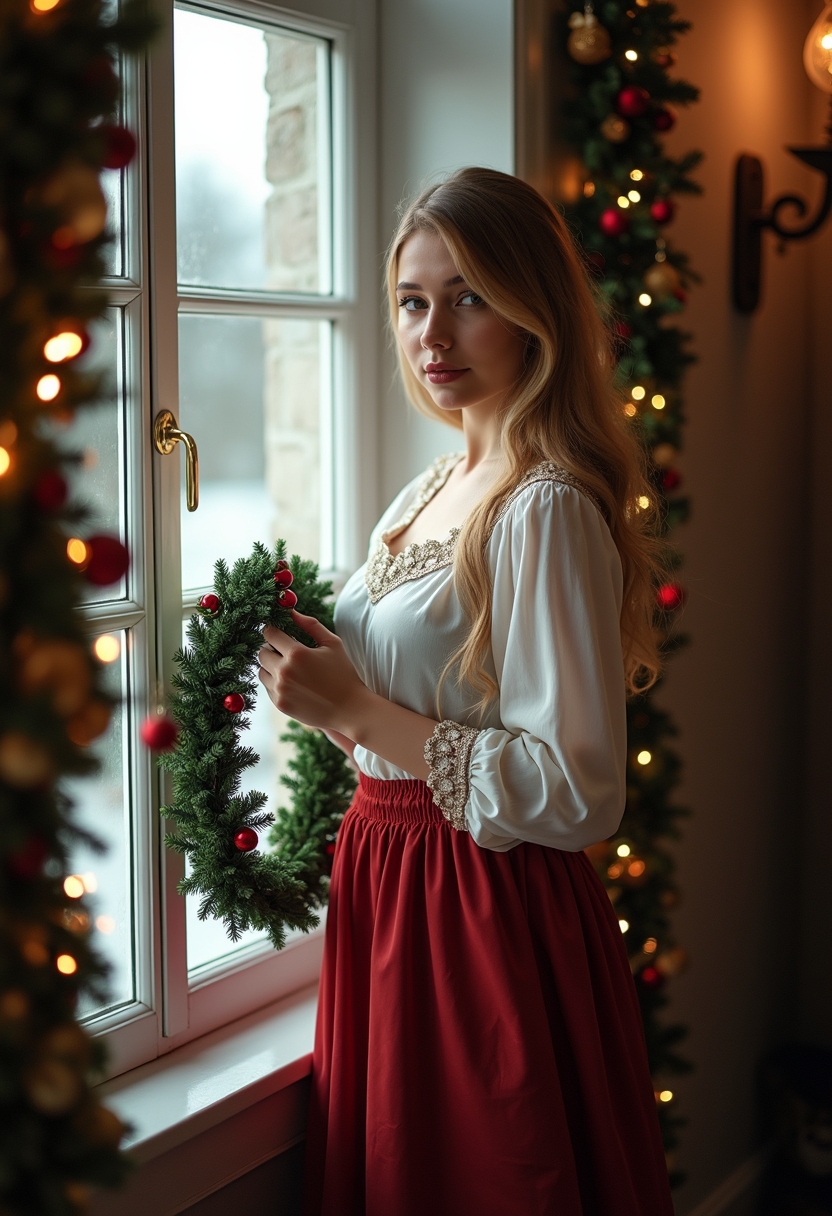 Женщина в длинной юбке и праздничной блузке стоит у окна, украшенного гирляндами, держит венок, смотрит прямо в камеру