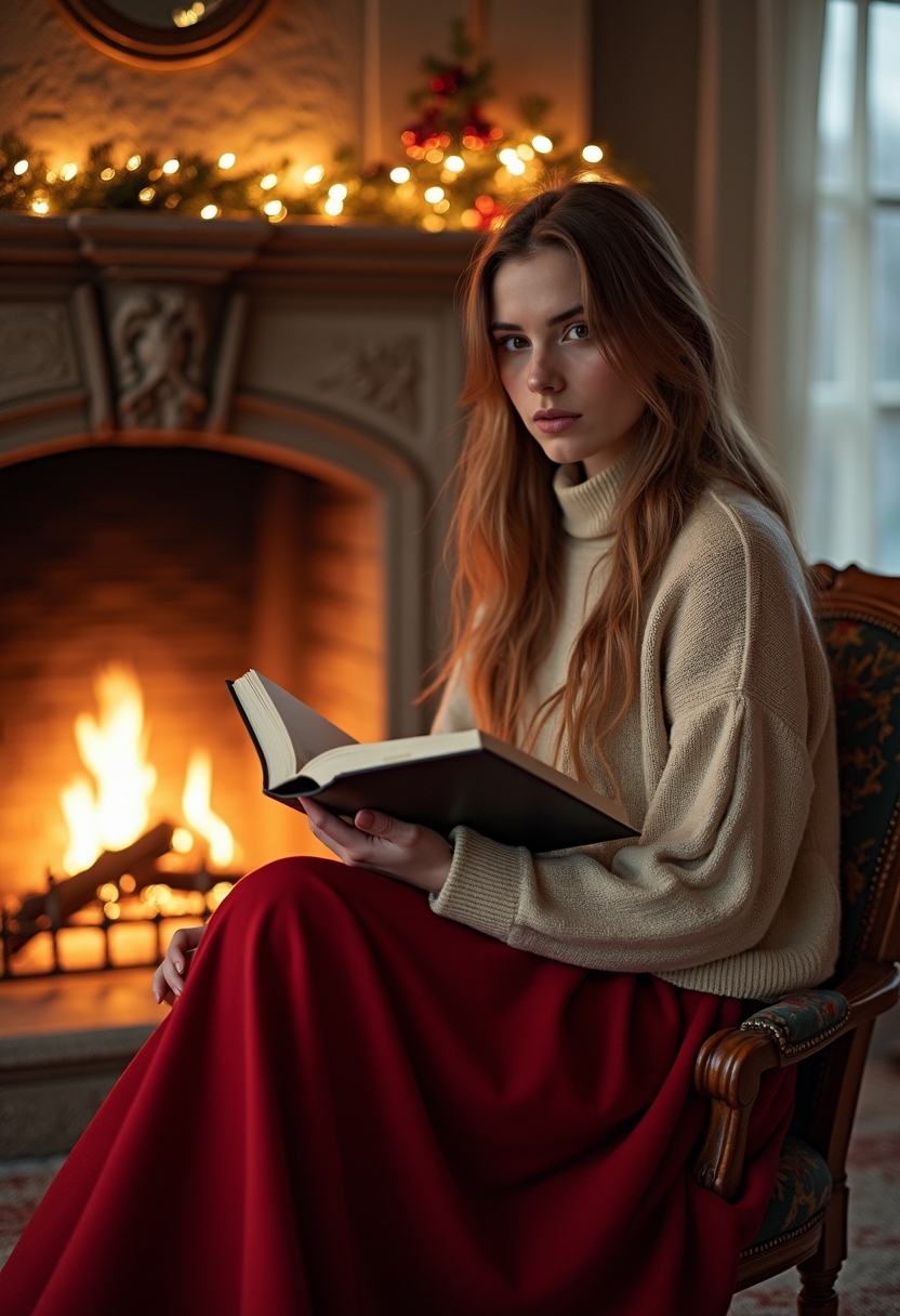 Женщина в длинной юбке и праздничной кофте сидит у камина с книжкой, смотрит в камеру, вокруг огоньки и декор