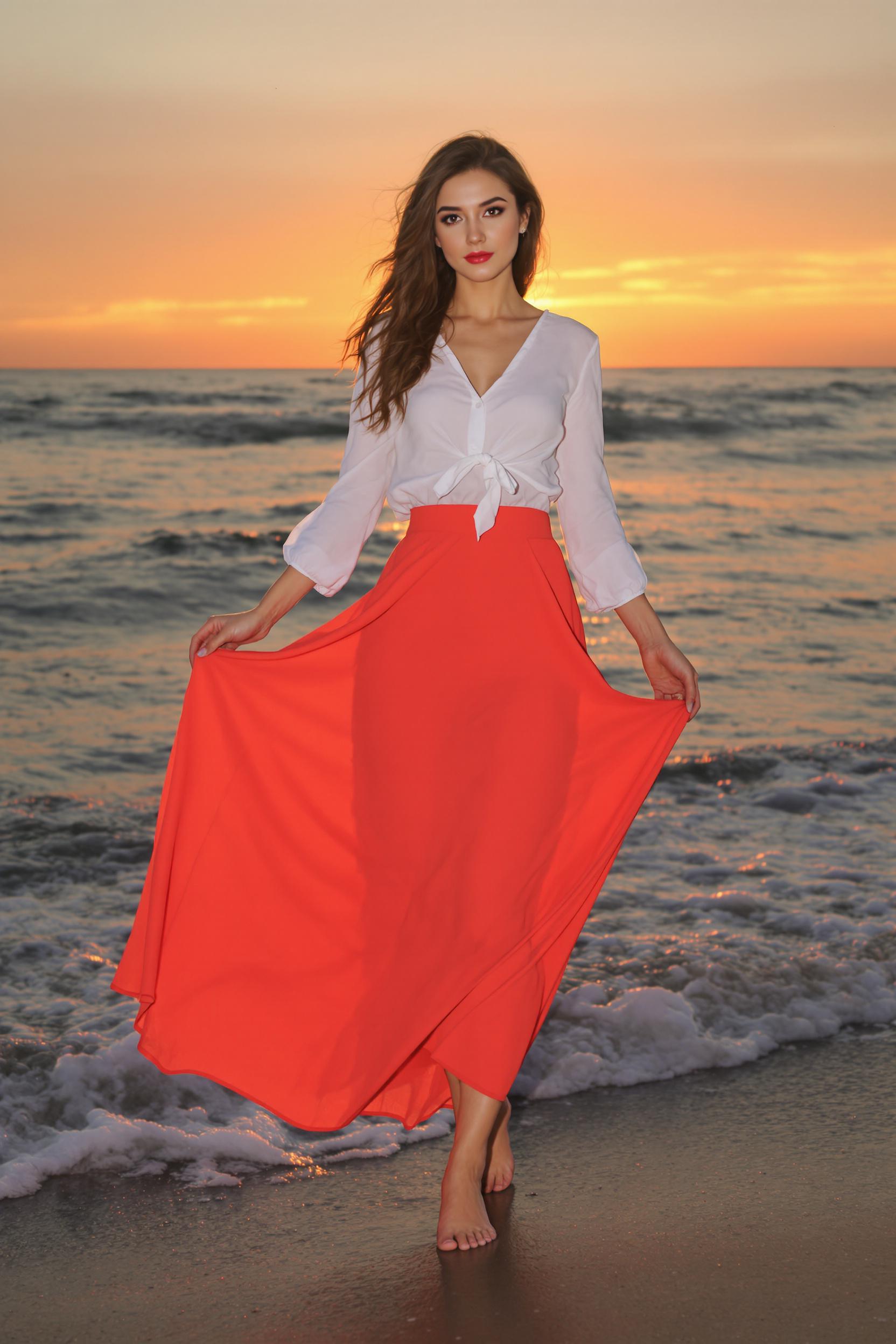 Женщина в длинной юбке яркого кораллового цвета и легкой белой блузе с рукавами, босиком стоит на берегу, слегка держит подол, закат раскрашивает небо и море теплыми оттенками, она смотрит прямо в камеру, позади волны.