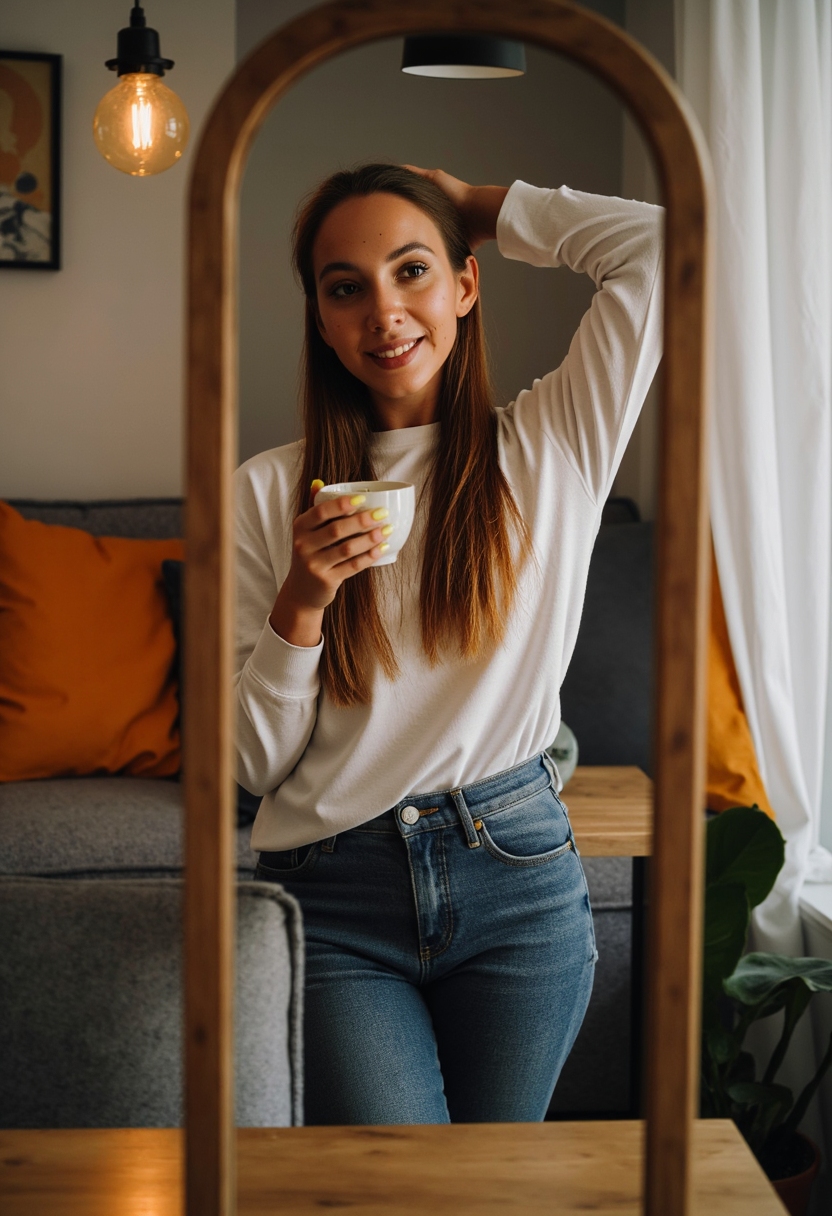 Женщина в джинсах и свитере делает селфи в зеркале кофейни, за ней видны деревянные столики и чашка капучино