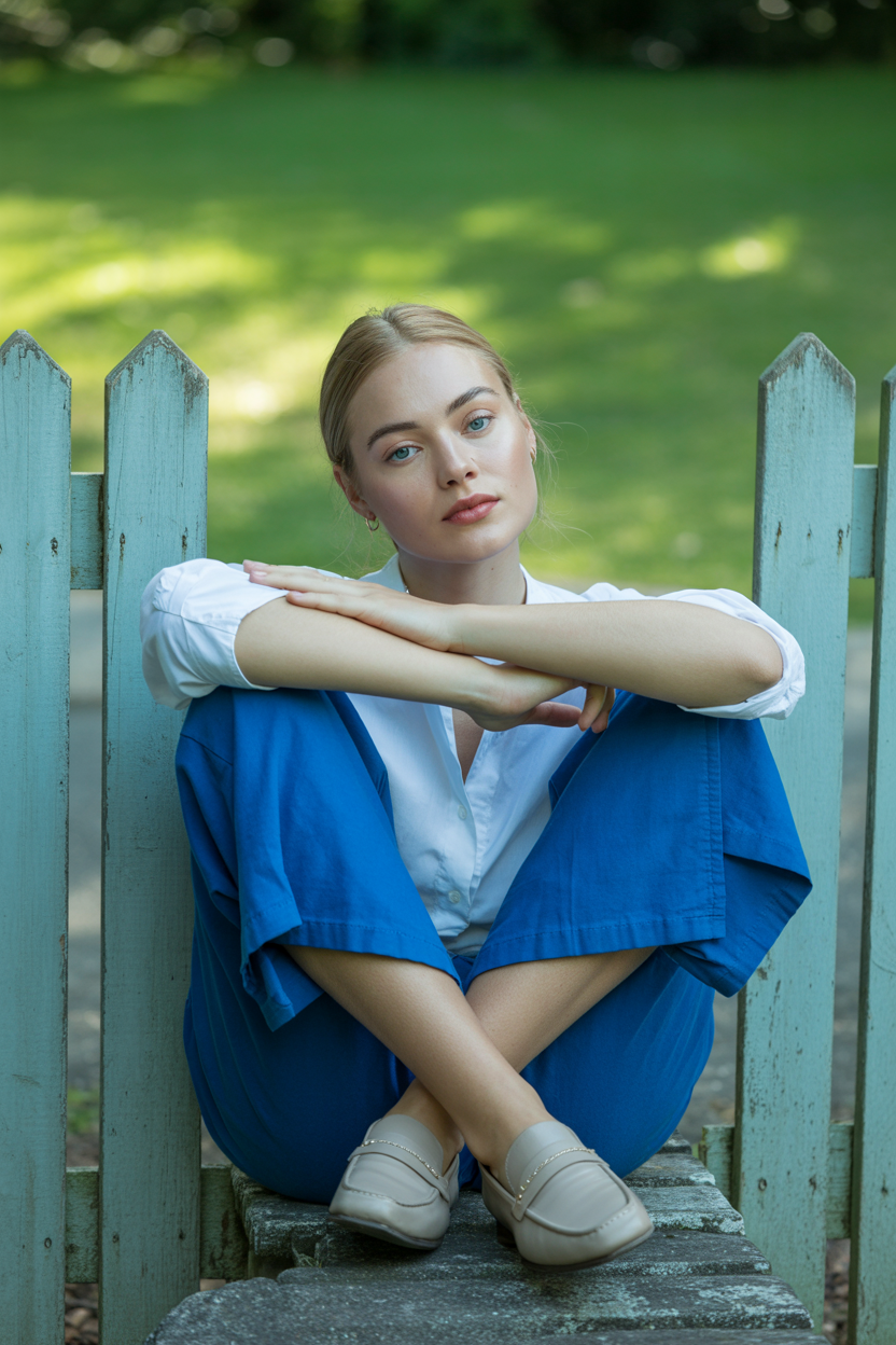 Женщина в джинсах-кюлотах насыщенного синего цвета и белой минималистичной хлопковой рубашке навыпуск с длинными рукавами, подвернутыми до локтя. На ногах светлые лоферы. Она стоит у пастельного деревянного забора, скрестив руки на груди, легкий наклон корпуса вперед, уверенно смотрит прямо в камеру. Крупный план, мягкий уличный фон.