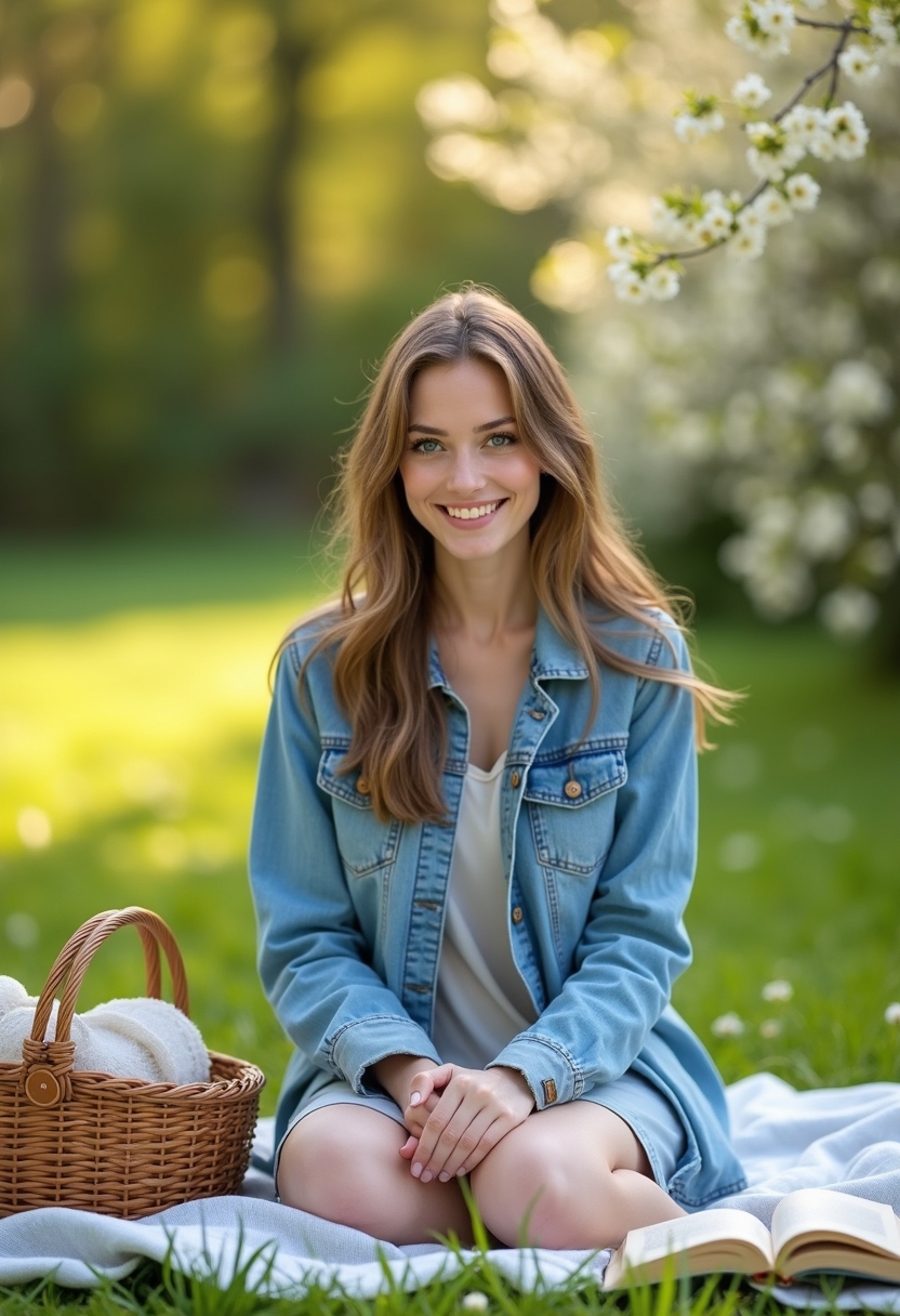 Женщина в джинсовой куртке и лёгком платье сидит на пледе на траве, рядом корзина для пикника и книга. Вокруг — яркая майская зелень и цветущие кусты. Она смотрит в камеру, улыбаясь. Крупный план, создающий ощущение отдыха и лёгкости.