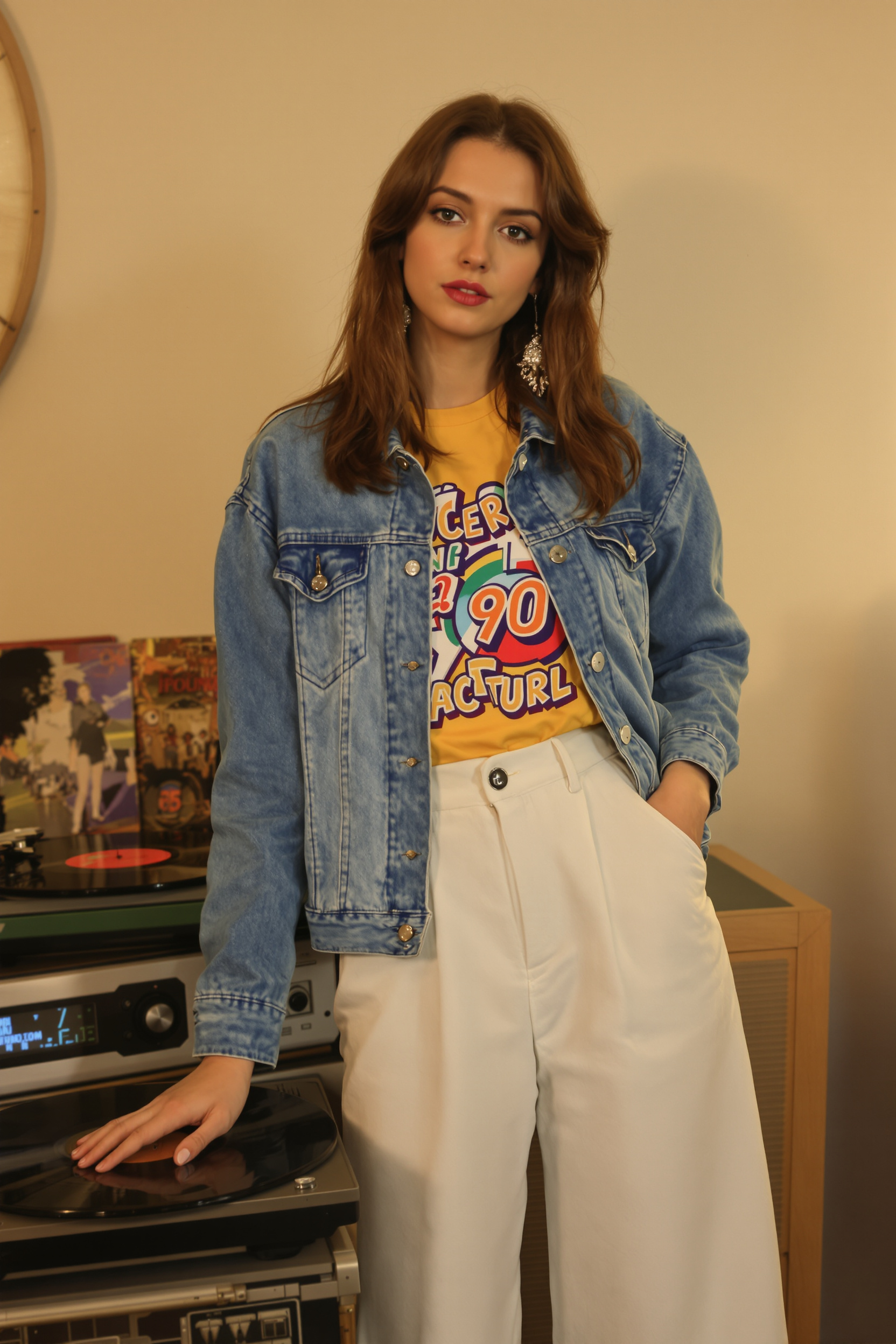Женщина в джинсовой куртке и широких брюках, яркая футболка с принтом 90-х, стоит у старого проигрывателя с пластинками, средний план, поза с опорой на одну руку, смотрит прямо в камеру, теплый ламповый свет.