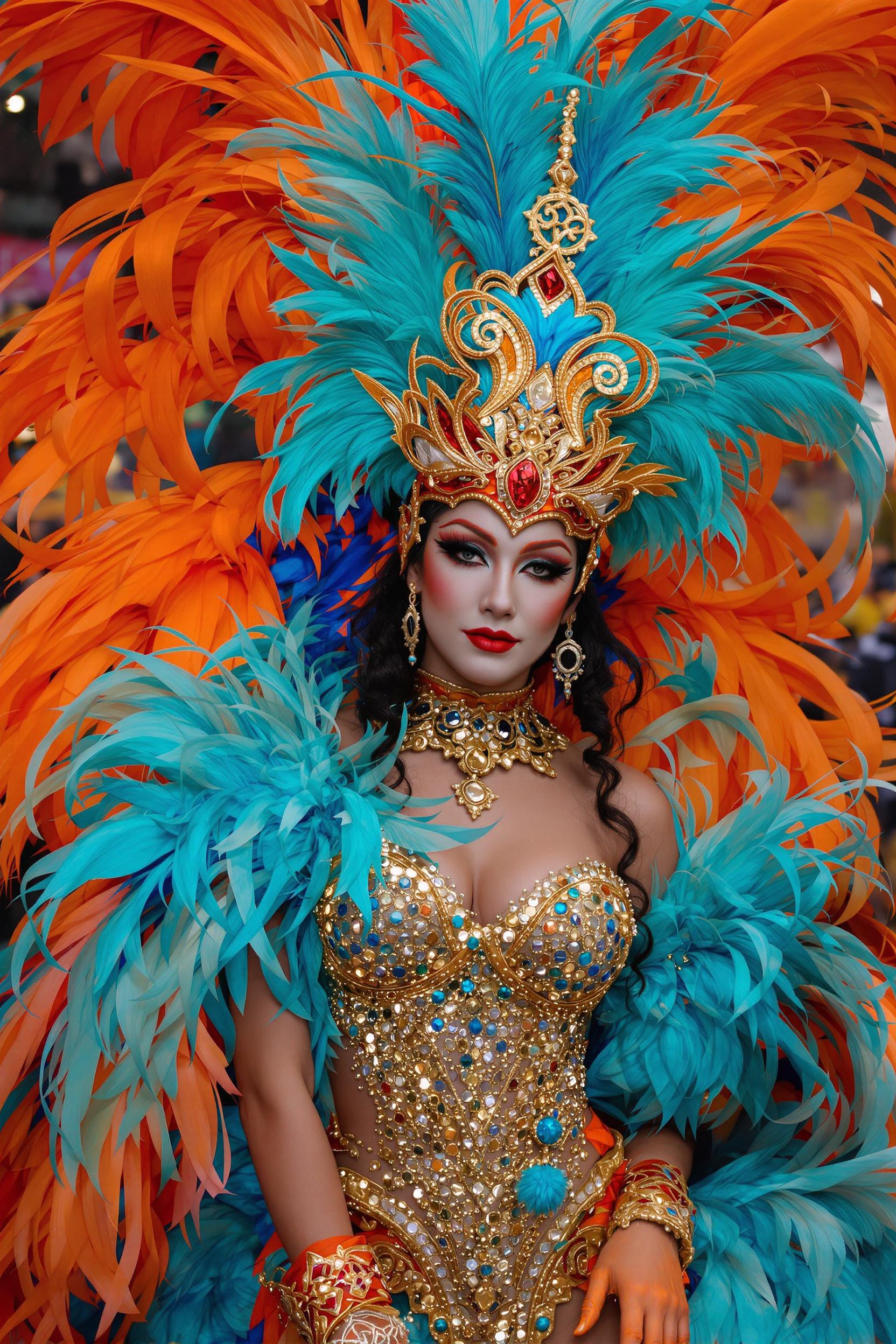 Примерить образ на себеЖенщина в роскошном бирюзово-зеленом карнавальном костюме: топ, полностью расшитый пайетками, объёмная юбка из длинных перьев, массивный украшенный бисером головной убор, сверкающие длинные перчатки, средний план, смотрит в камеру, фон — пестрые гирлянды и веселье Рио.