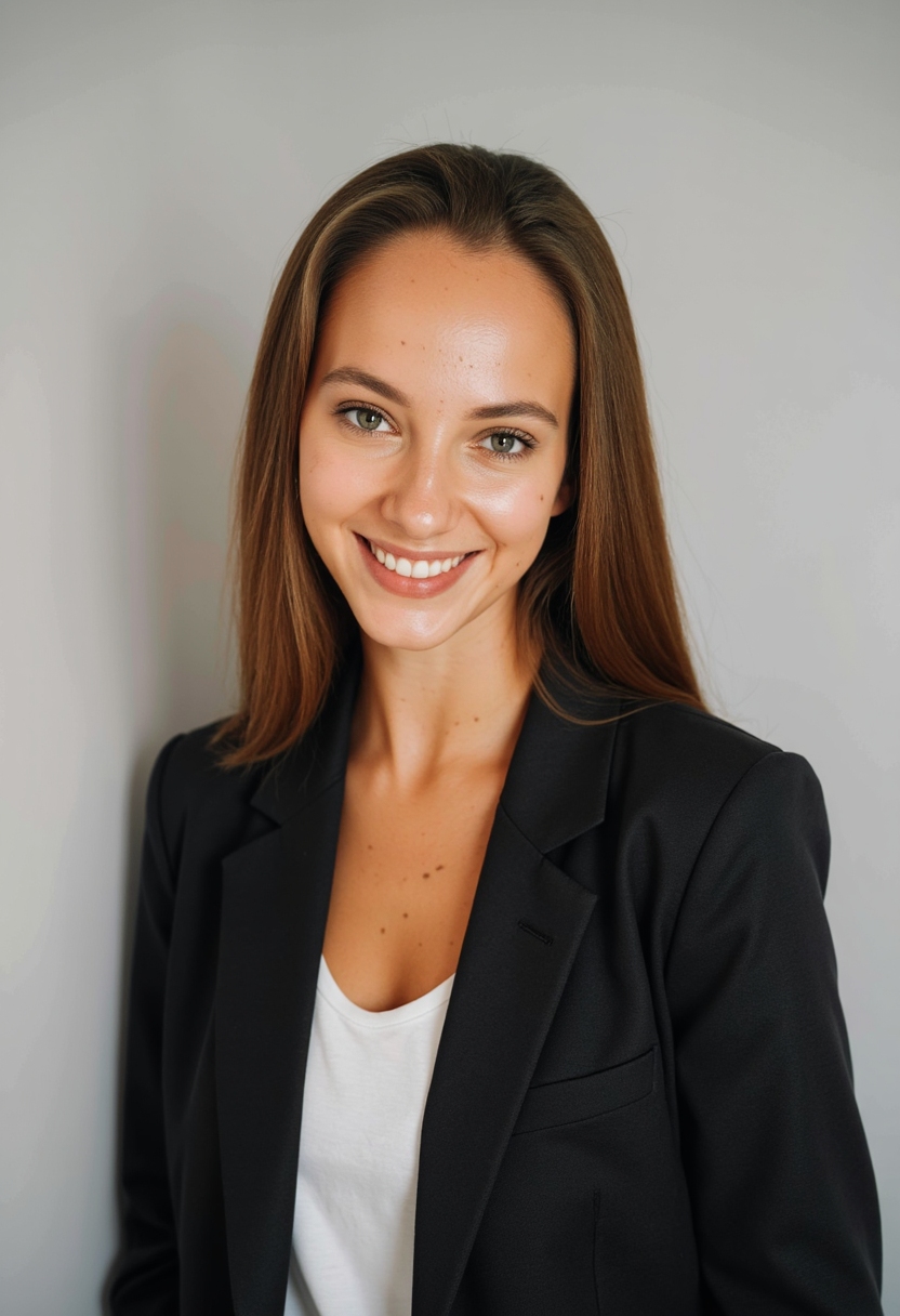Женщина в элегантном блейзере и белой рубашке с легким макияжем, на фоне светло-серого цвета, смотрит прямо в камеру