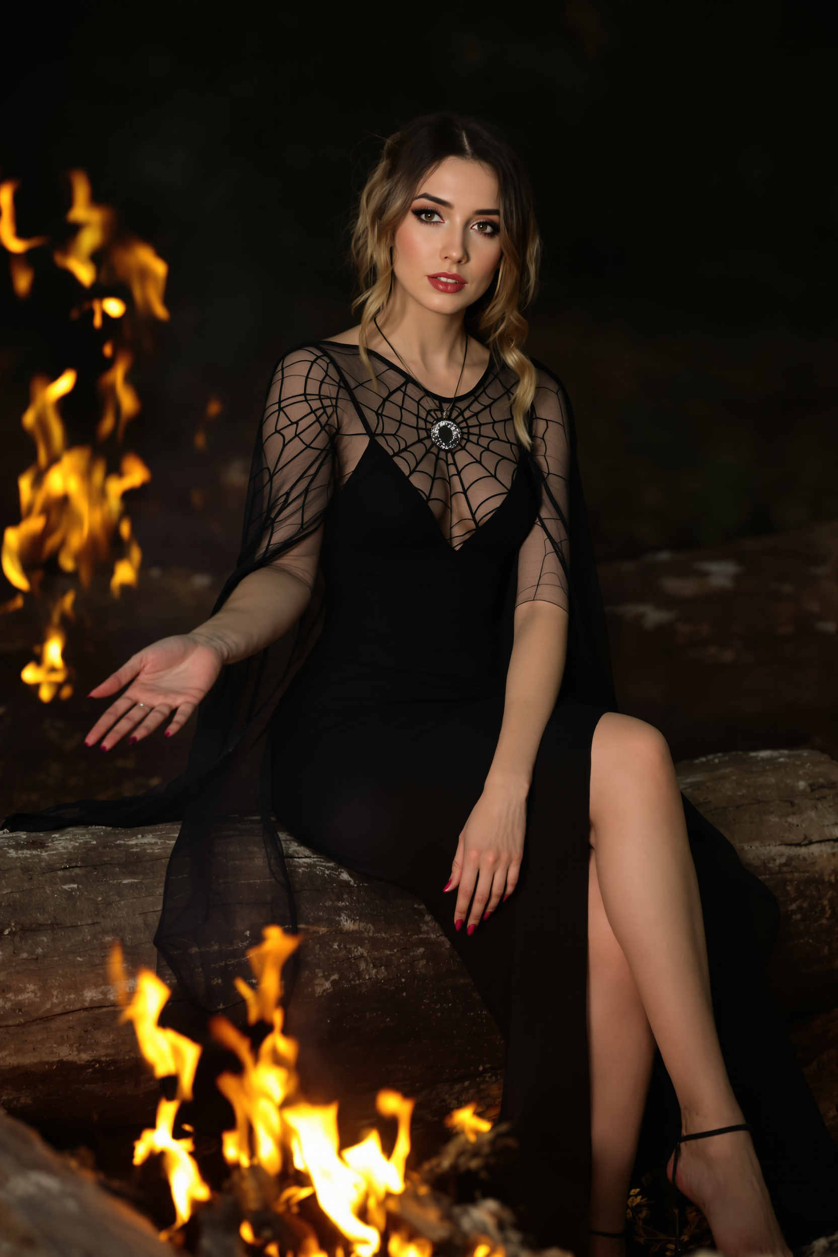 Женщина в элегантном чёрном платье с разрезом до бедра, на плечах полупрозрачная паутинка-накидка, на шее — кулон в форме луны. Она сидит на коряге у ведьминого костра, вытягивает в сторону руку с зажатой в ней сушёной травой, смотрит прямо в камеру, поза динамичная.