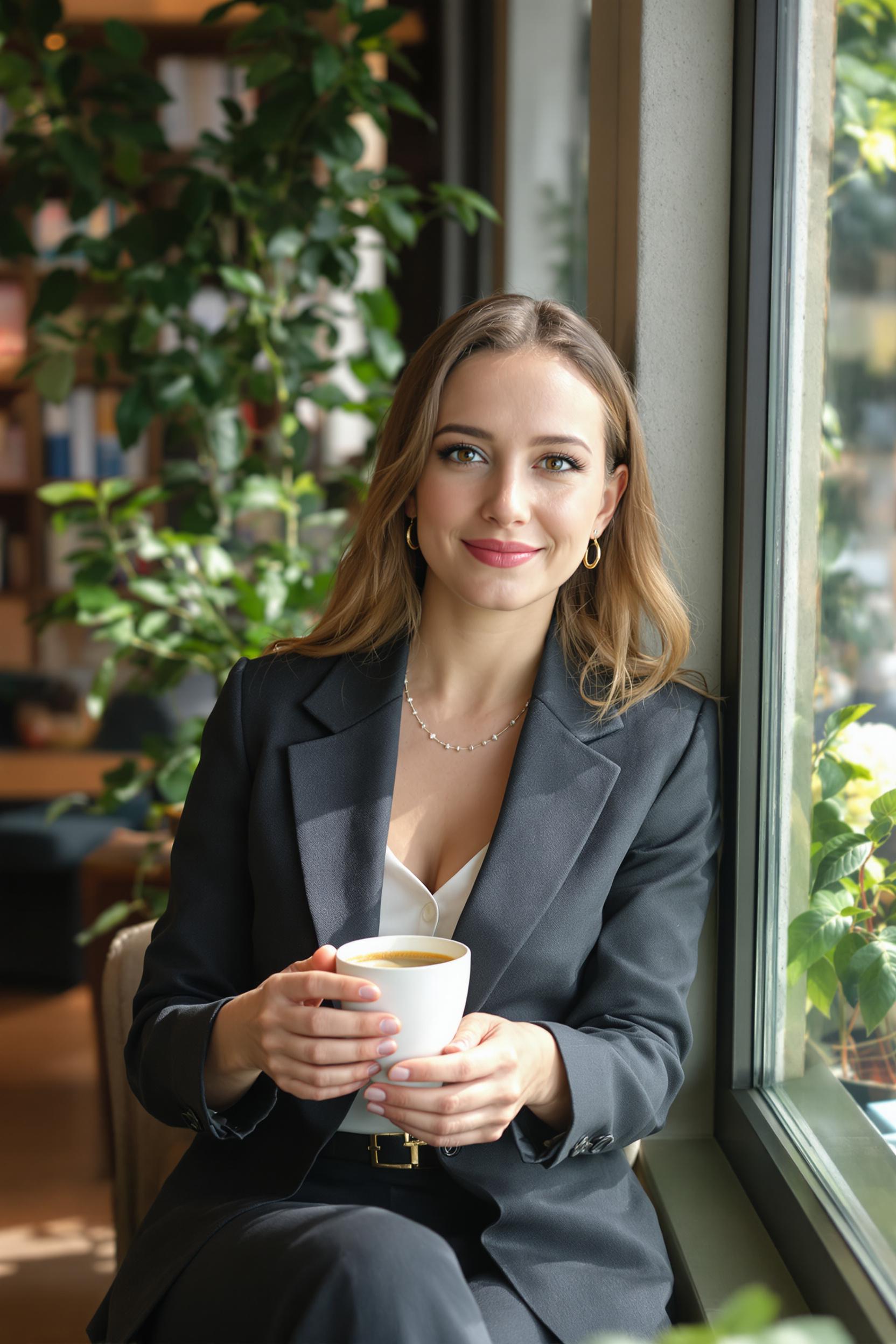 Женщина в деловом костюме у окна кофейни с эспрессо