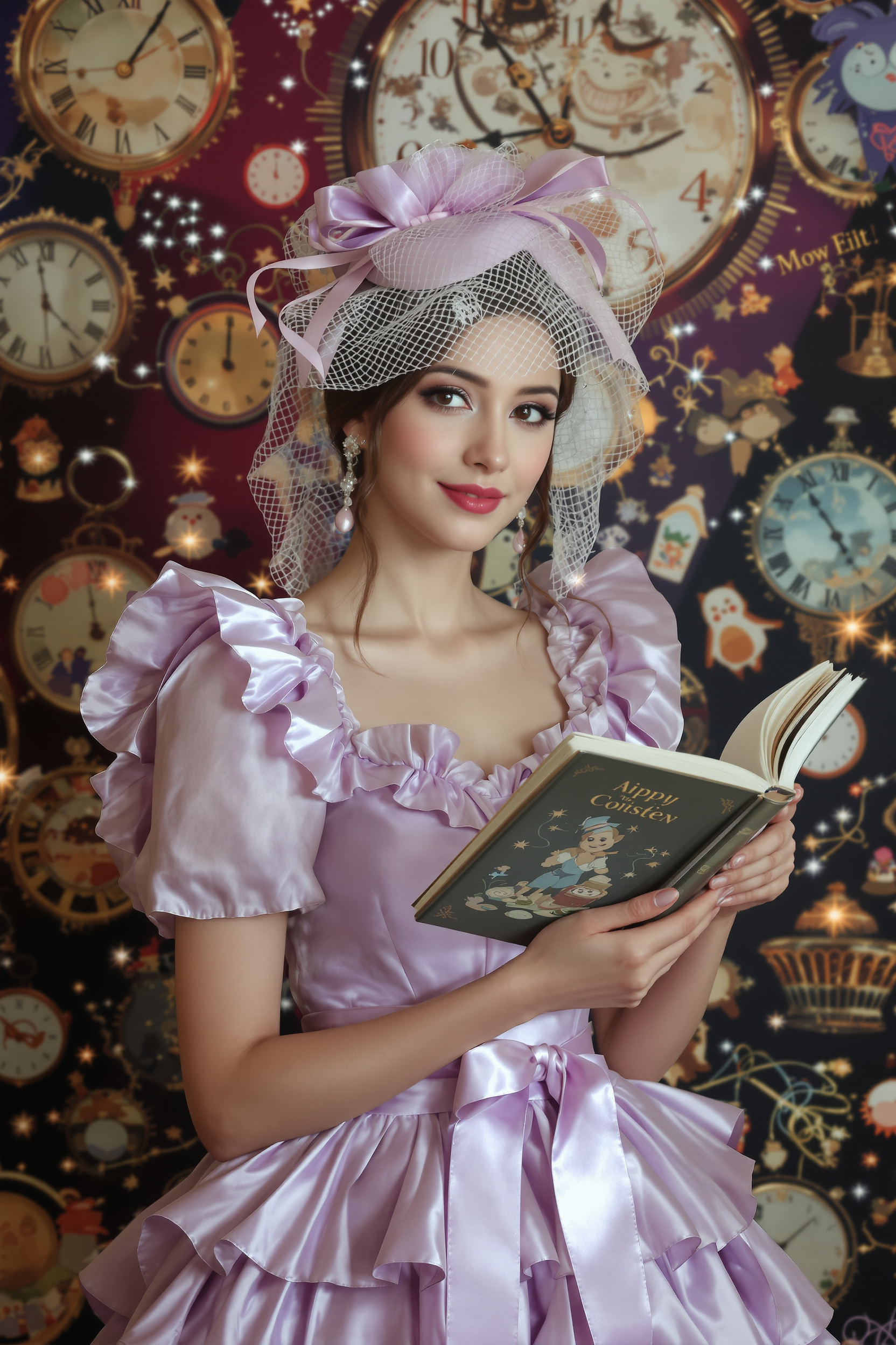 Женщина в элегантном лавандовом платье с оборками и длинной атласной лентой на талии, на голове мини-шляпка с вуалью, в руке раскрытая книга с необычными иллюстрациями, фон — причудливые сверкающие часы и усмешка Чеширского Кота, средний план, взгляд в камеру