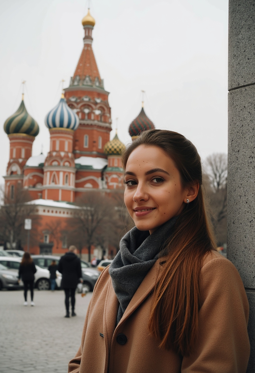 Женщина в зимнем костюме с меховым капюшоном стоит на фоне красной кирпичной стены Кремля, смотрит прямо в камеру