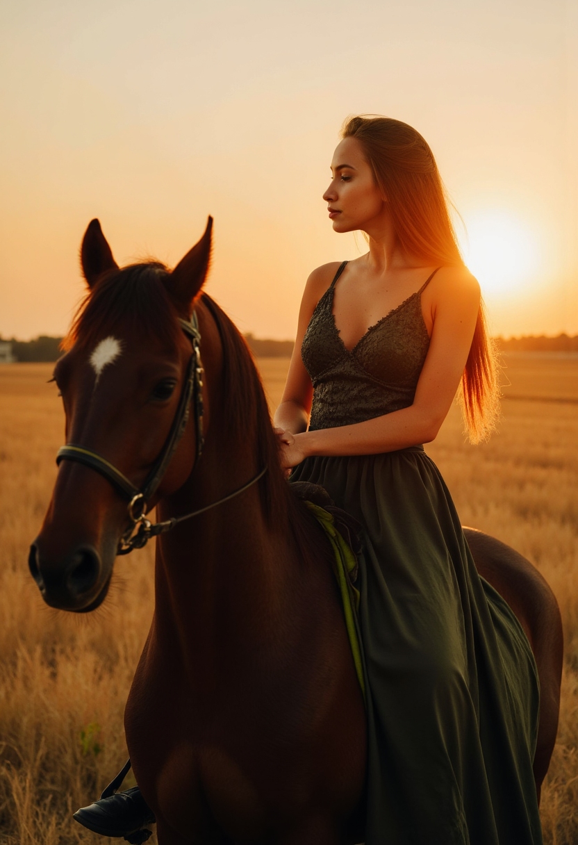 Женщина в элегантном вечернем платье сидит верхом на чёрной лошади, вокруг вечерний закат и открытое поле