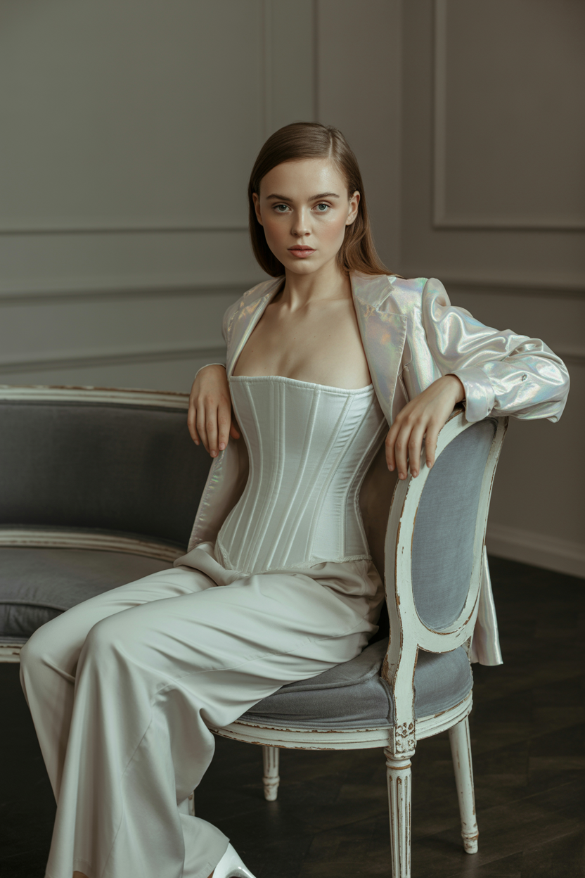 Женщина в элегантной фотостудии с классической лепниной, одета в белоснежный сатиновый корсет, длинные кремовые брюки-палаццо и светлый жакет из переливчатого материала. Она сидит на спинке стула, повернувшись лицом к камере, одну руку положив на спинку, взгляд целеустремлённый и открытый.