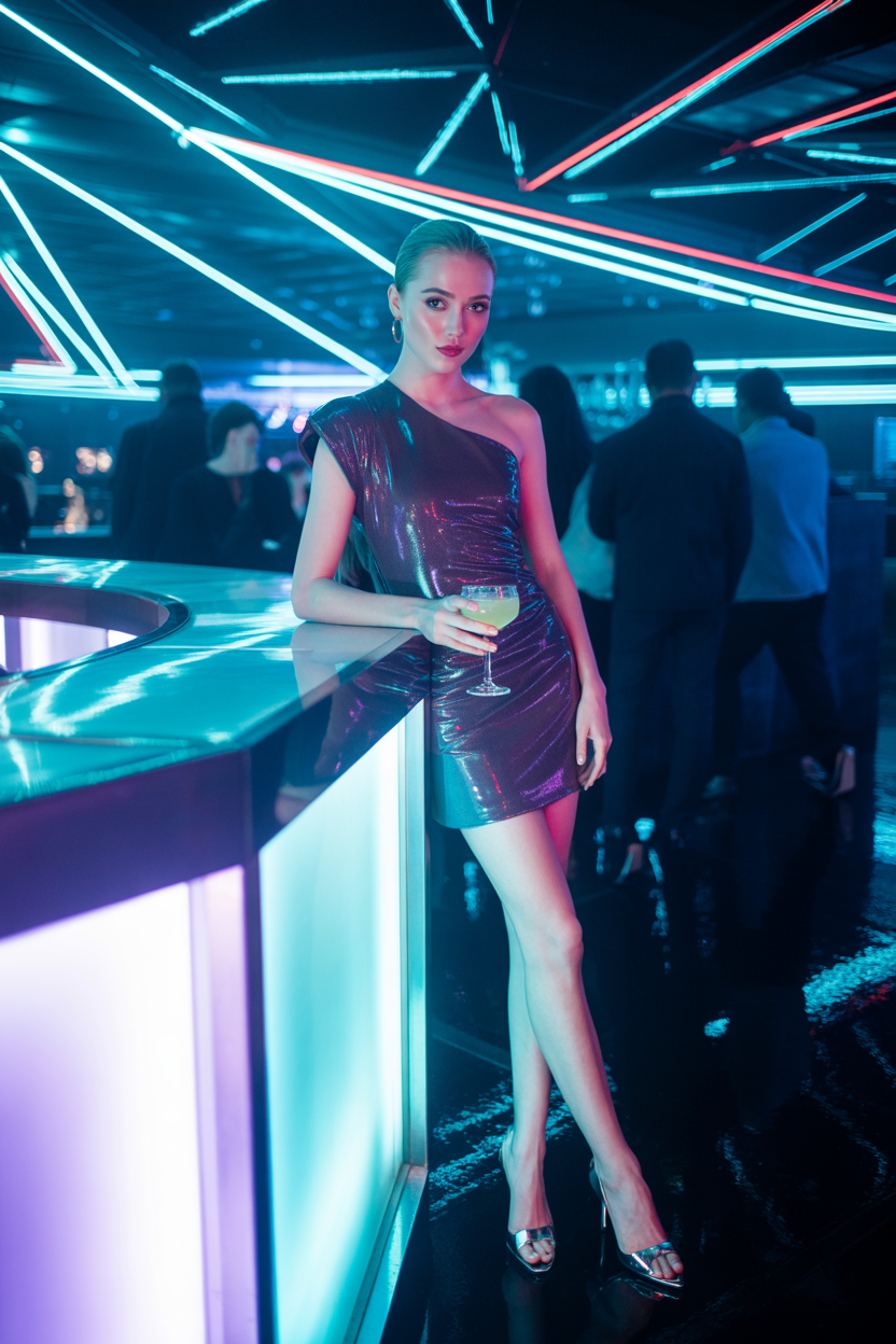 Женщина в футуристическом клубе, одета в переливающееся фиолетово-бирюзовое мини-платье с асимметричной линией плеча и серебристые туфли на тонком каблуке, стоит у прозрачной стойки с яркой подсветкой, держит в руке бокал, расслабленно опираясь на стойку, и смотрит прямо в камеру. Вокруг лазерные лучи и динамичные световые узоры.