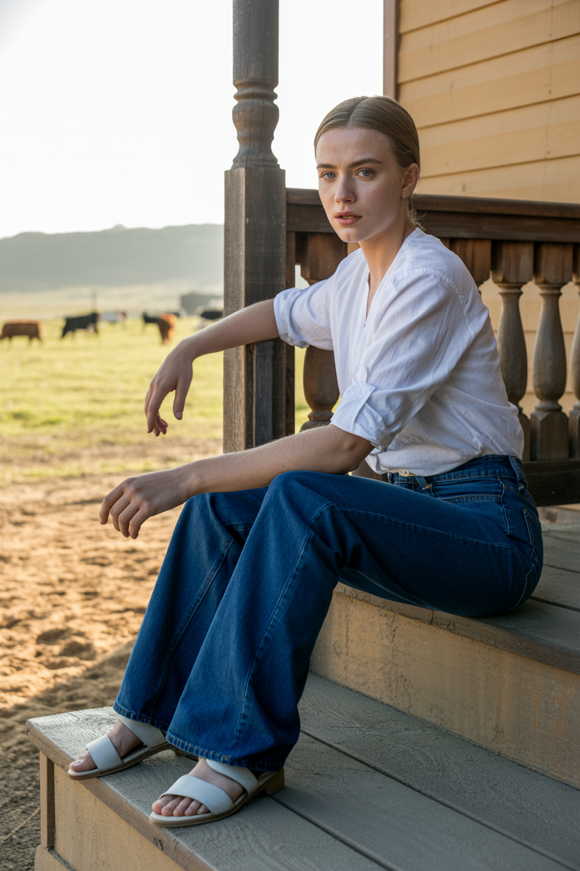 Женщина в глубоких синих джинсах-клеш и белой хлопковой рубашке без лишнего декора, рукава закатаны до локтя. На ногах светлые минималистичные сандалии. Она сидит на деревянной ступеньке наружной веранды, одной рукой опирается на балясину, вторая опущена на колено, уверенно смотрит прямо в камеру. Фон — уличная ранчо-локация.