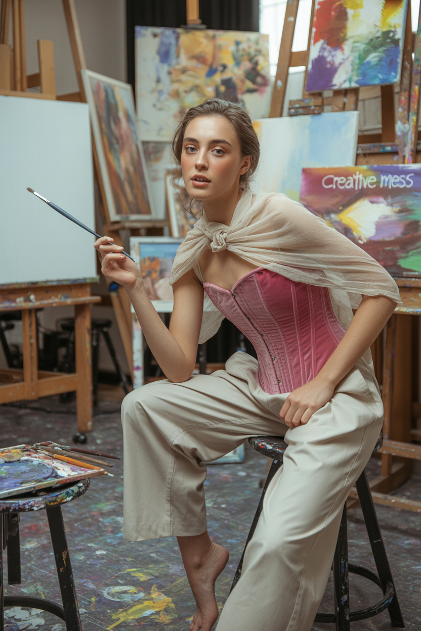 Женщина в художественной мастерской среди мольбертов и картин, одета в розовый бархатный корсет, свободные кремовые брюки и легкий прозрачный палантин на плечах. Она сидит на табурете, скрестив ноги, держит в руках кисть, прямо и мягко смотрит в камеру, вокруг творческий беспорядок.