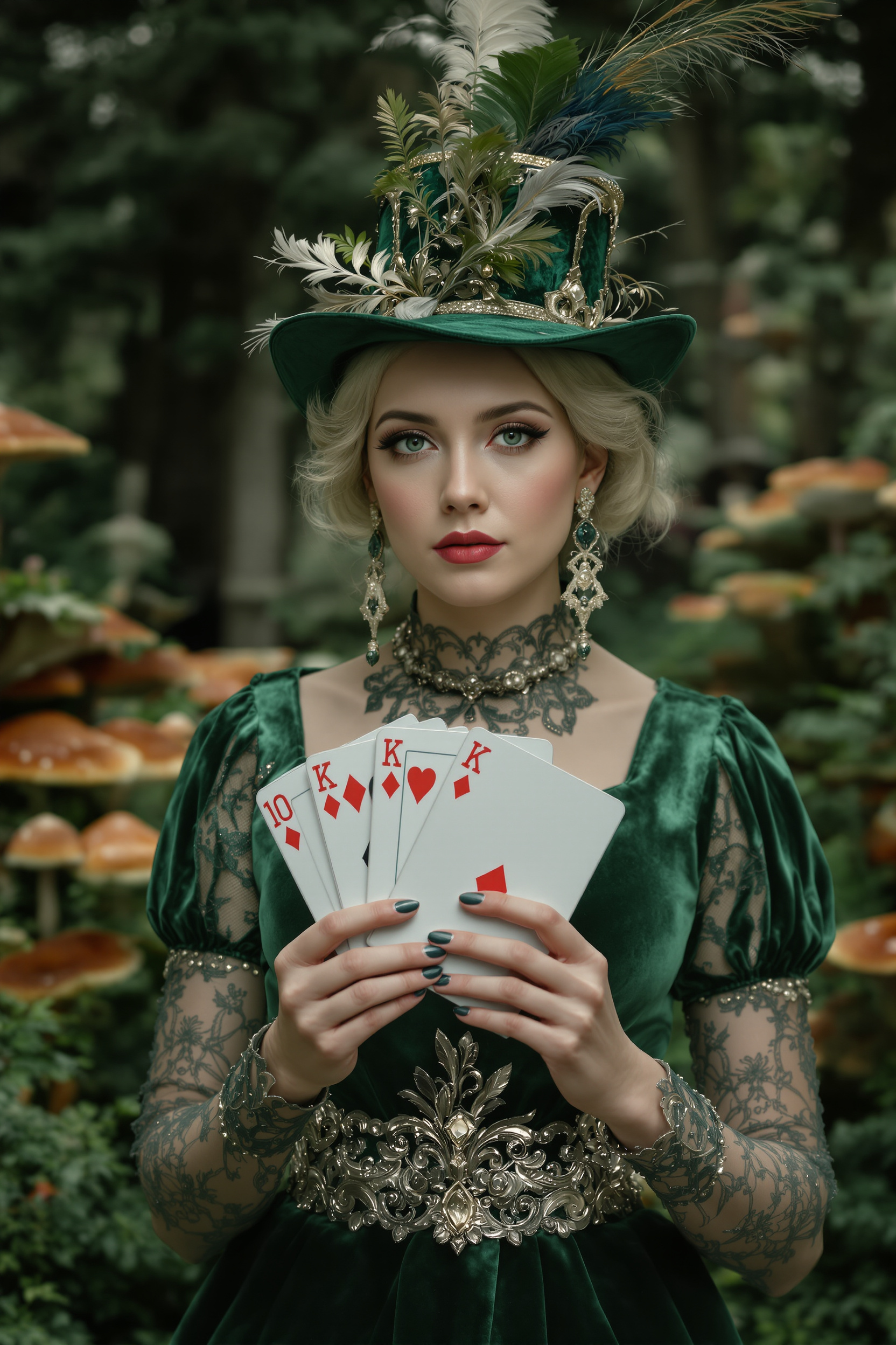 Женщина в изумрудном бархатном платье с кружевными рукавами, на талии серебристый пояс, на голове миниатюрная цилиндрическая шляпа с перьями, обеими руками держит старинные большие игральные карты, фон — фантастический грибной лес, средний план, пристальный взгляд в камеру.