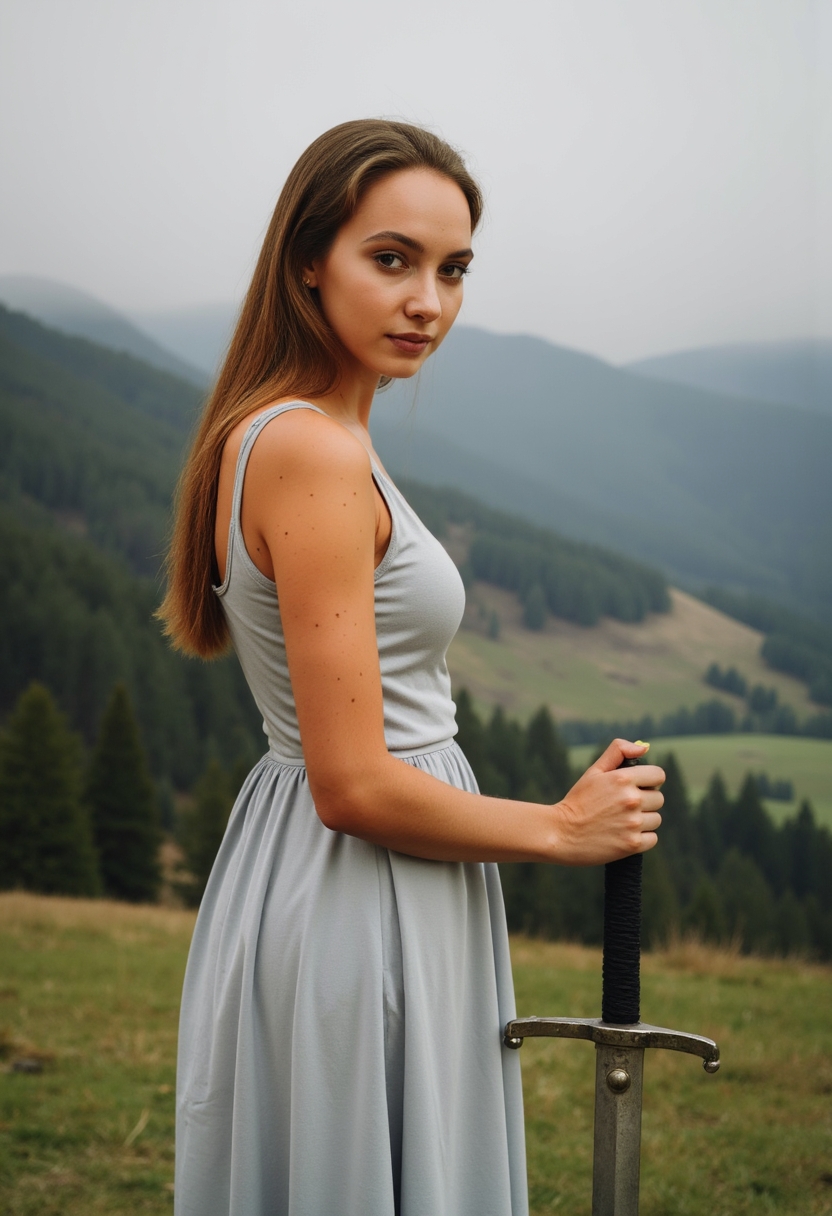 Женщина в изящном серебристом платье с мечом в руках стоит на фоне туманной долины, смотрит прямо в камеру