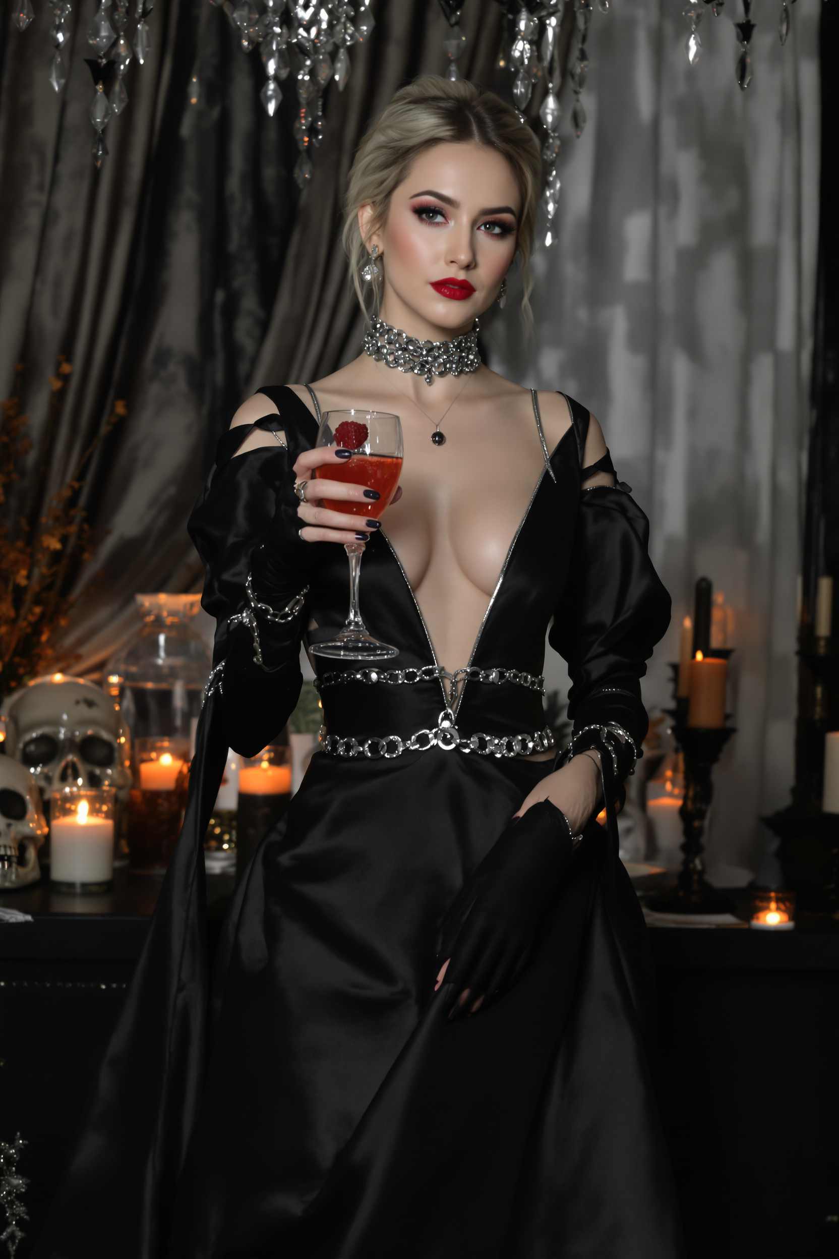 Женщина в изысканном вечернем платье из черного атласа с длинными рукавами и глубоким вырезом, поверхности ткани отливают серебром, пояс декорирован серебряными цепочками. Стоит в средний план, прямо смотрит в камеру. В руках — бокал с малиновым напитком, рядом хрустальный череп и свечи, интерьер с элементами Хэллоуина.