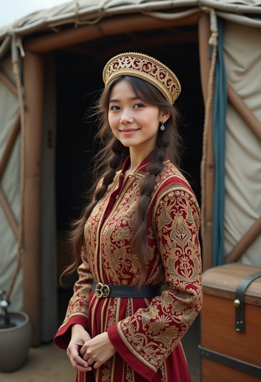 Женщина в казахском головном уборе (кимешек) и платье с золотистой вышивкой стоит у юрты с деревянным сундуком. Она смотрит в камеру с лёгкой улыбкой. Крупный план, акцент на тепле и традиционности.