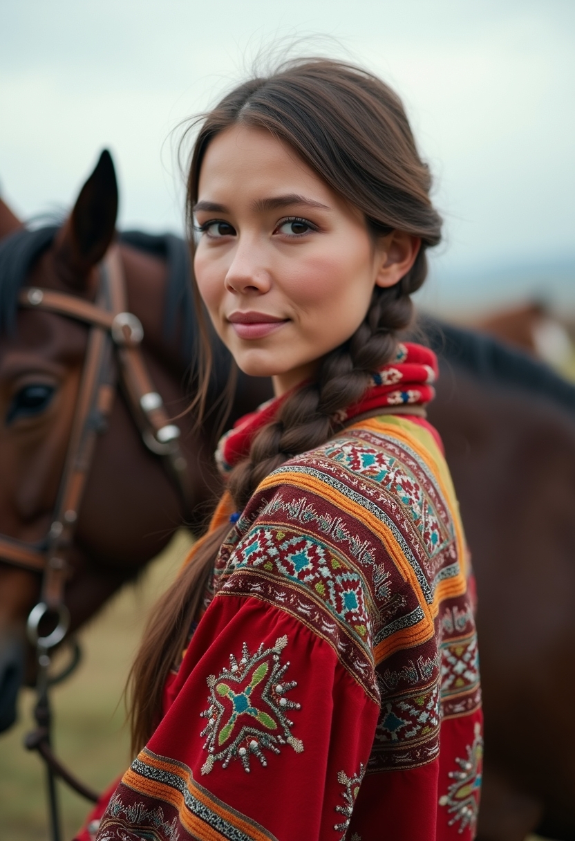 Примерить образ на себеЖенщина в казахской верхней одежде с узором в традиционной палитре стоит у погонщика с табуном. Она оборачивается на камеру с лёгкой полуулыбкой. Крупный план, акцент на динамике и бытии в движении.